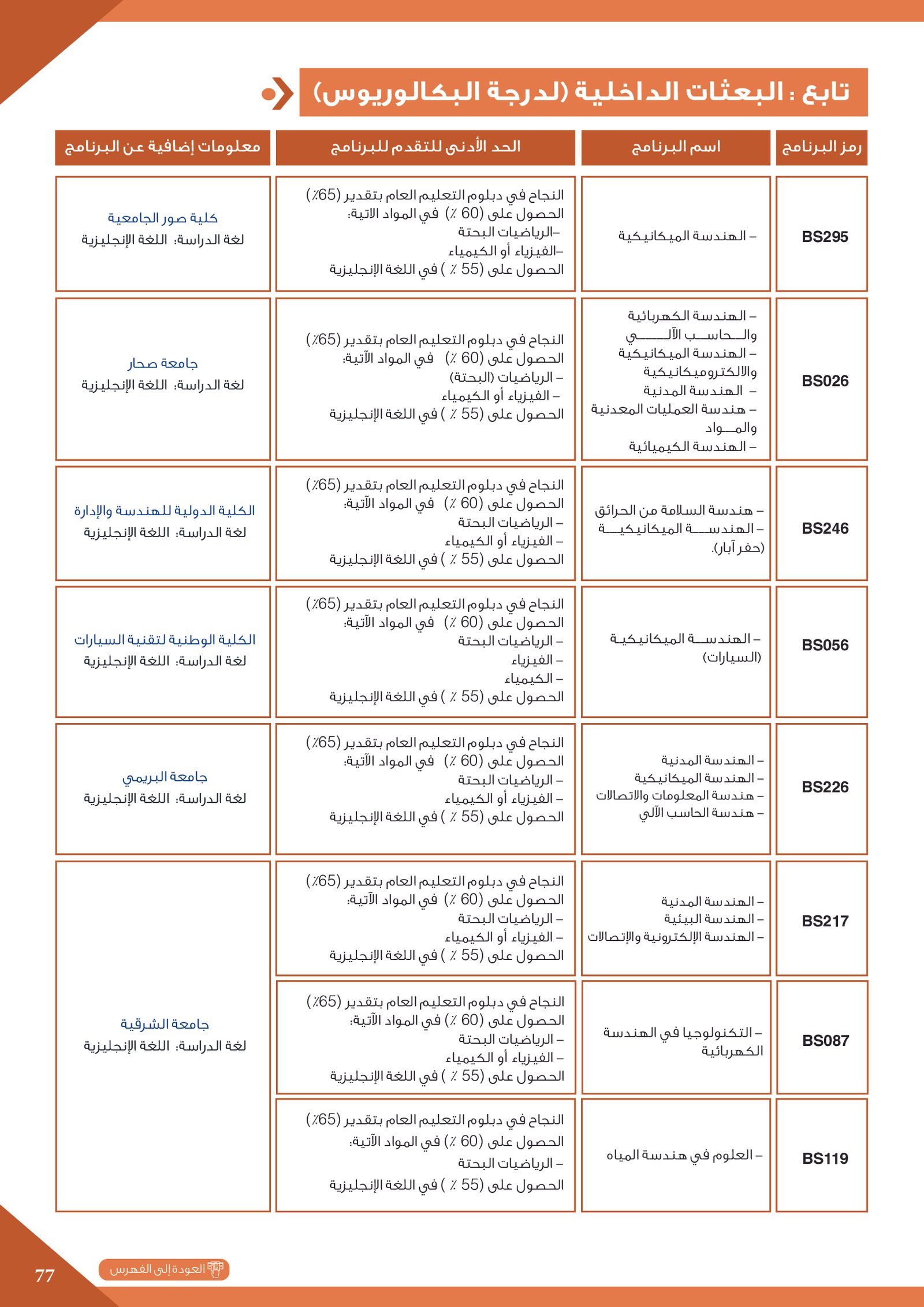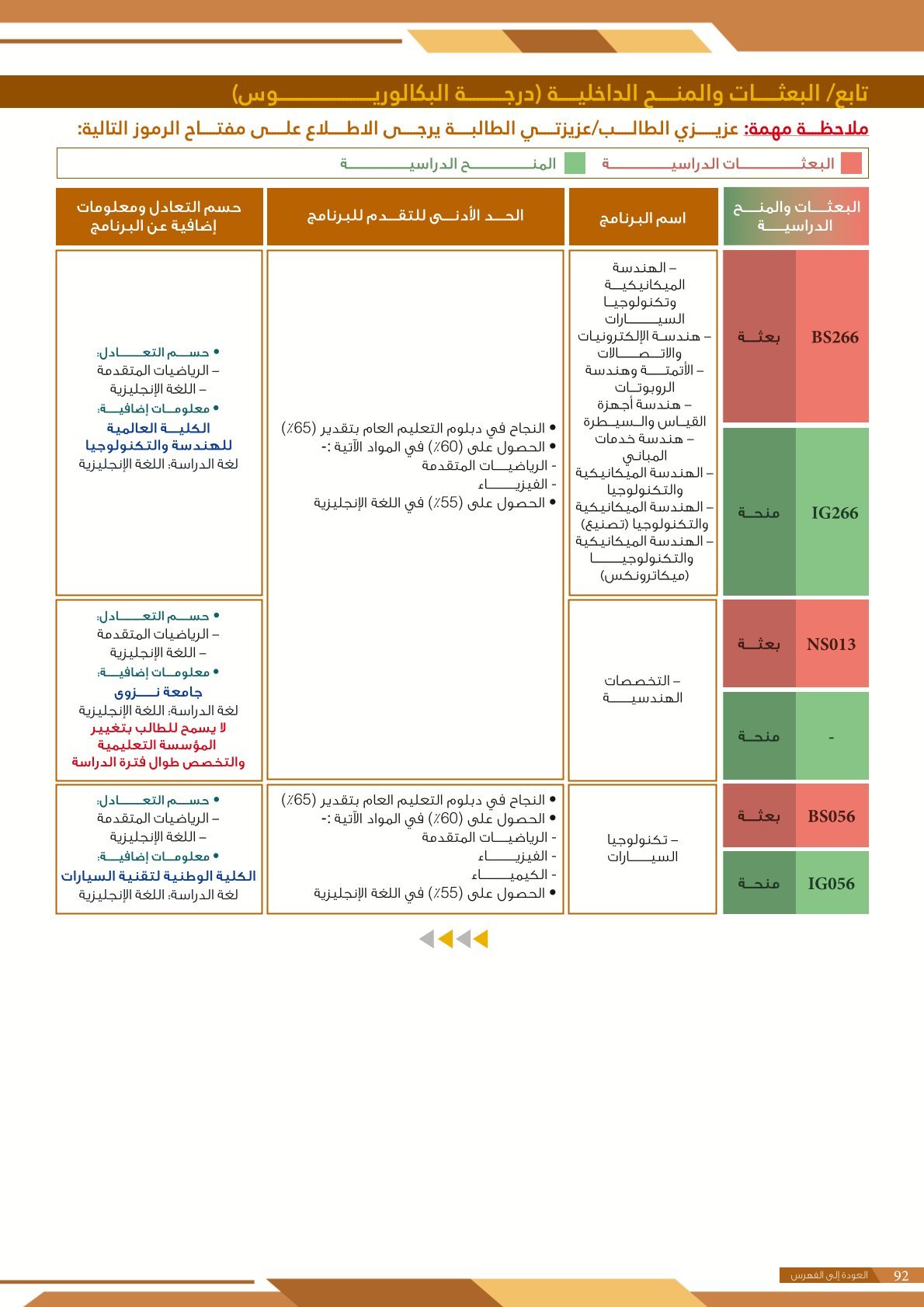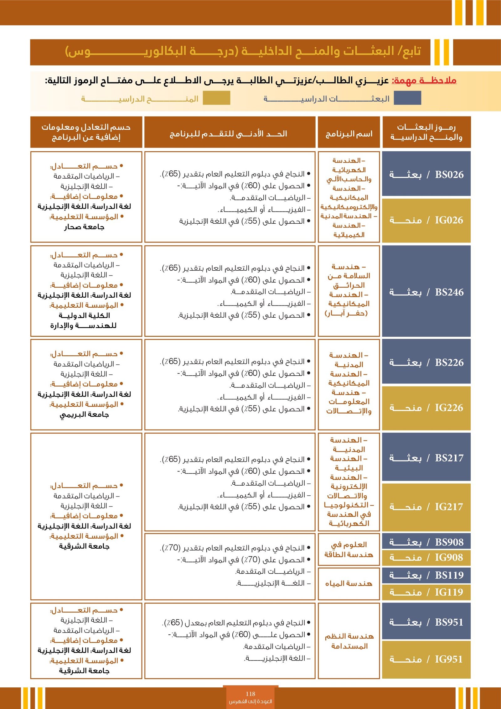 | BS262 | التخصصات الهندسية ( إعاقات الجسدية ) | البعثات الداخلية | أخرى | التفاصيل بالمرجع | مجالات دراسية وتطبيقية تهتم بتصميم وتطوير وتحليل الأنظمة والبُنى والأجهزة التي تلبي احتياجات الإنسان والمجتمع. تشمل هذه التخصصات مجالات متعددة مثل: الهندسة المدنية، الهندسة المعمارية، الهندسة الكهربائية، الهندسة الميكانيكية، هندسة الحاسوب، والهندسة الصناعية. وتهدف إلى إعداد مهندسين قادرين على حل المشكلات التقنية، وتحسين جودة الحياة من خلال الابتكار والتخطيط العلمي في مجالات البناء، الطاقة، التقنية، والإنتاج. |