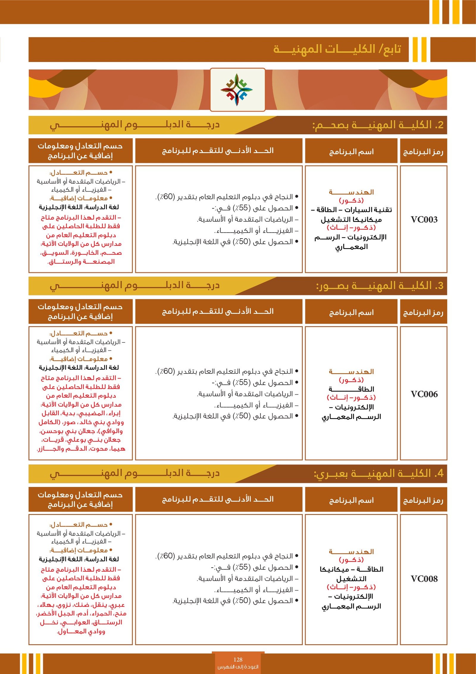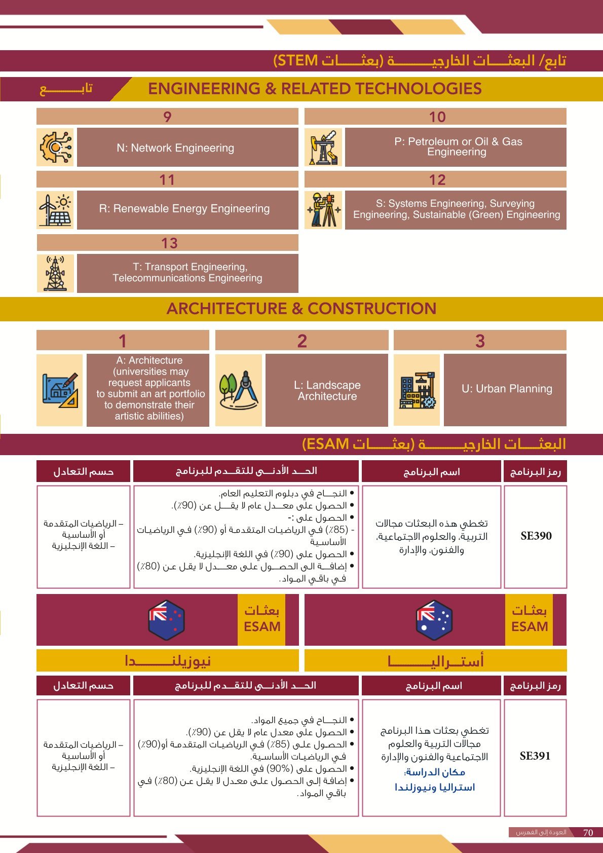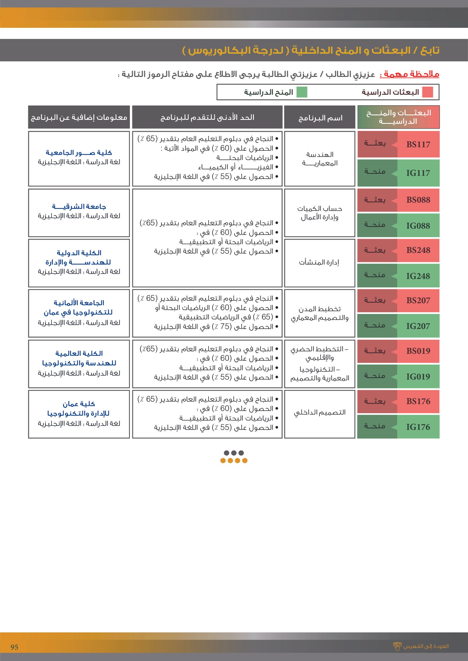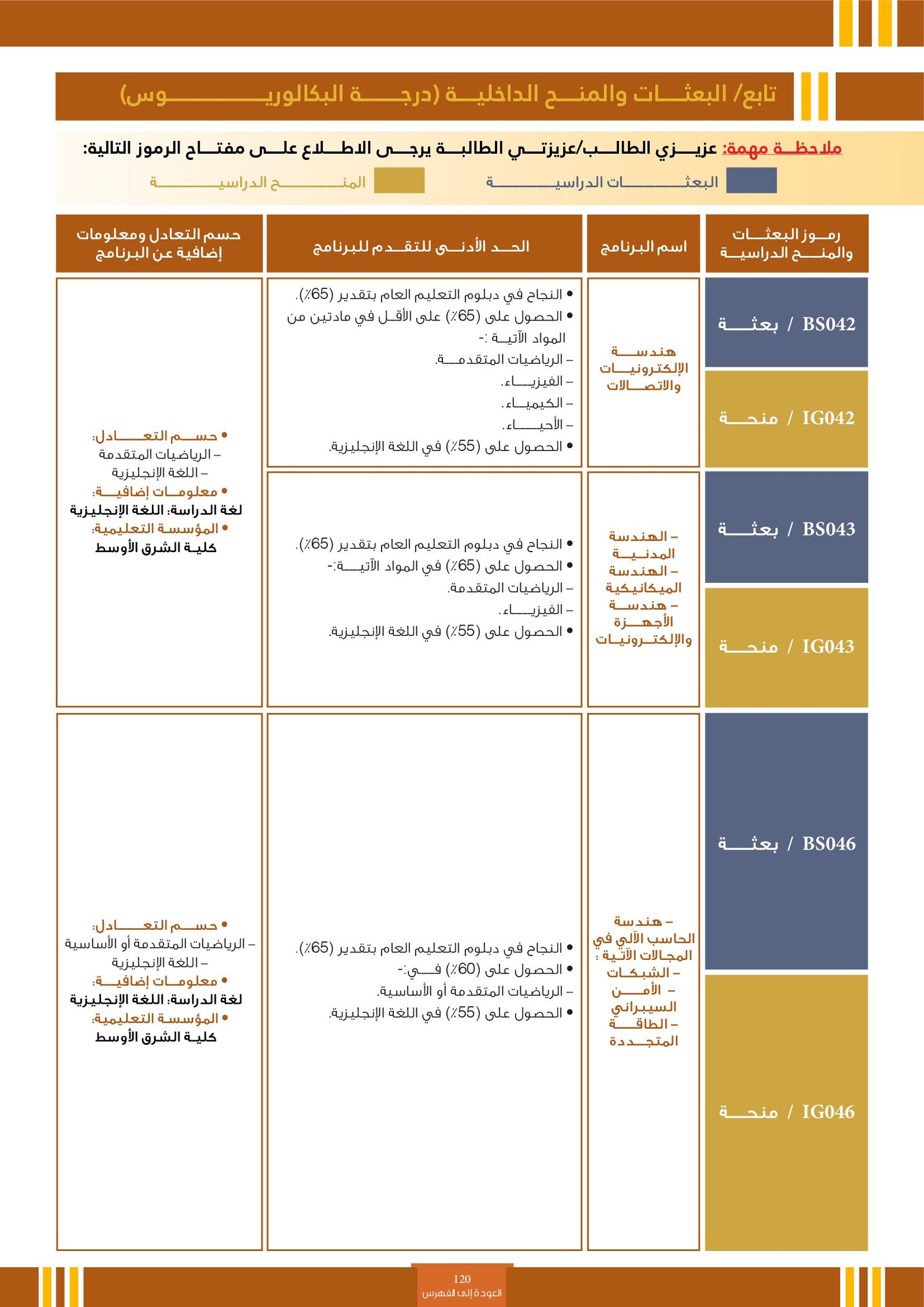 | BS262 | التخصصات الهندسية ( إعاقات الجسدية ) | البعثات الداخلية | أخرى | التفاصيل بالمرجع | مجالات دراسية وتطبيقية تهتم بتصميم وتطوير وتحليل الأنظمة والبُنى والأجهزة التي تلبي احتياجات الإنسان والمجتمع. تشمل هذه التخصصات مجالات متعددة مثل: الهندسة المدنية، الهندسة المعمارية، الهندسة الكهربائية، الهندسة الميكانيكية، هندسة الحاسوب، والهندسة الصناعية. وتهدف إلى إعداد مهندسين قادرين على حل المشكلات التقنية، وتحسين جودة الحياة من خلال الابتكار والتخطيط العلمي في مجالات البناء، الطاقة، التقنية، والإنتاج. |