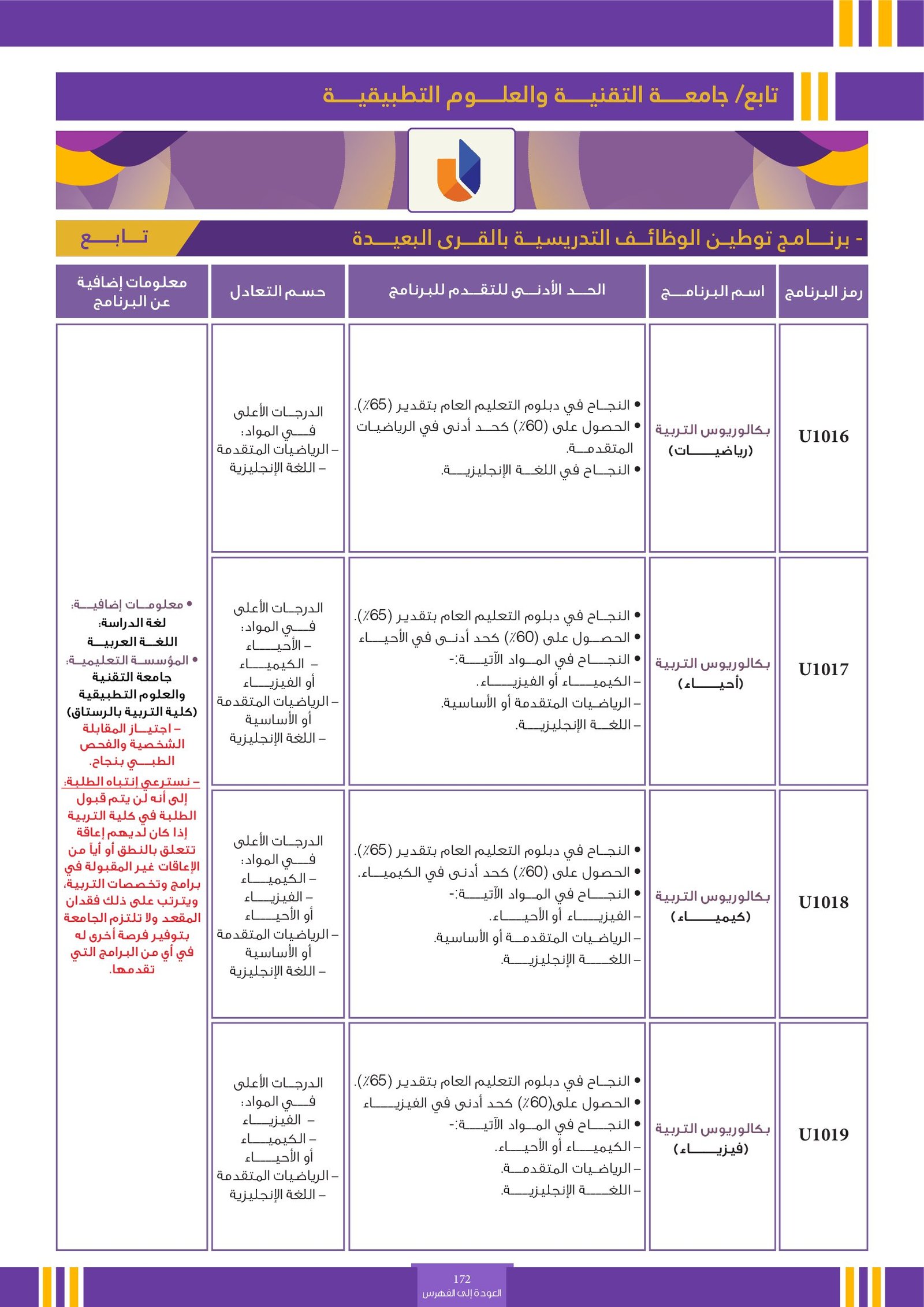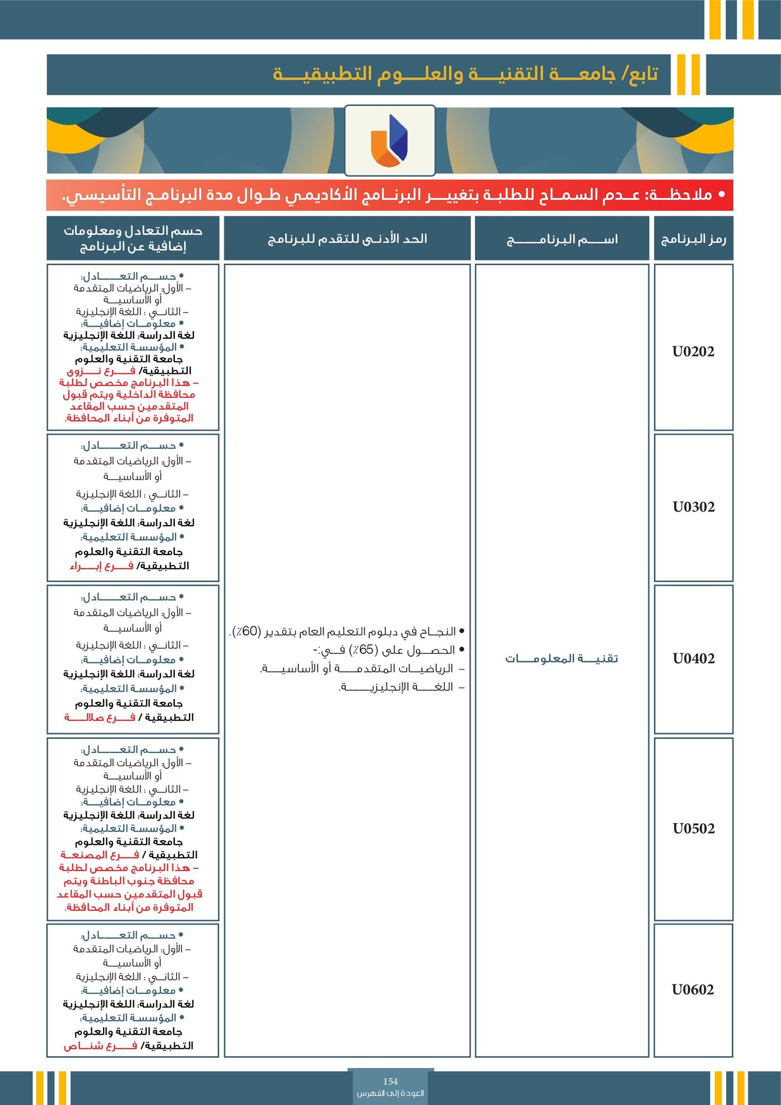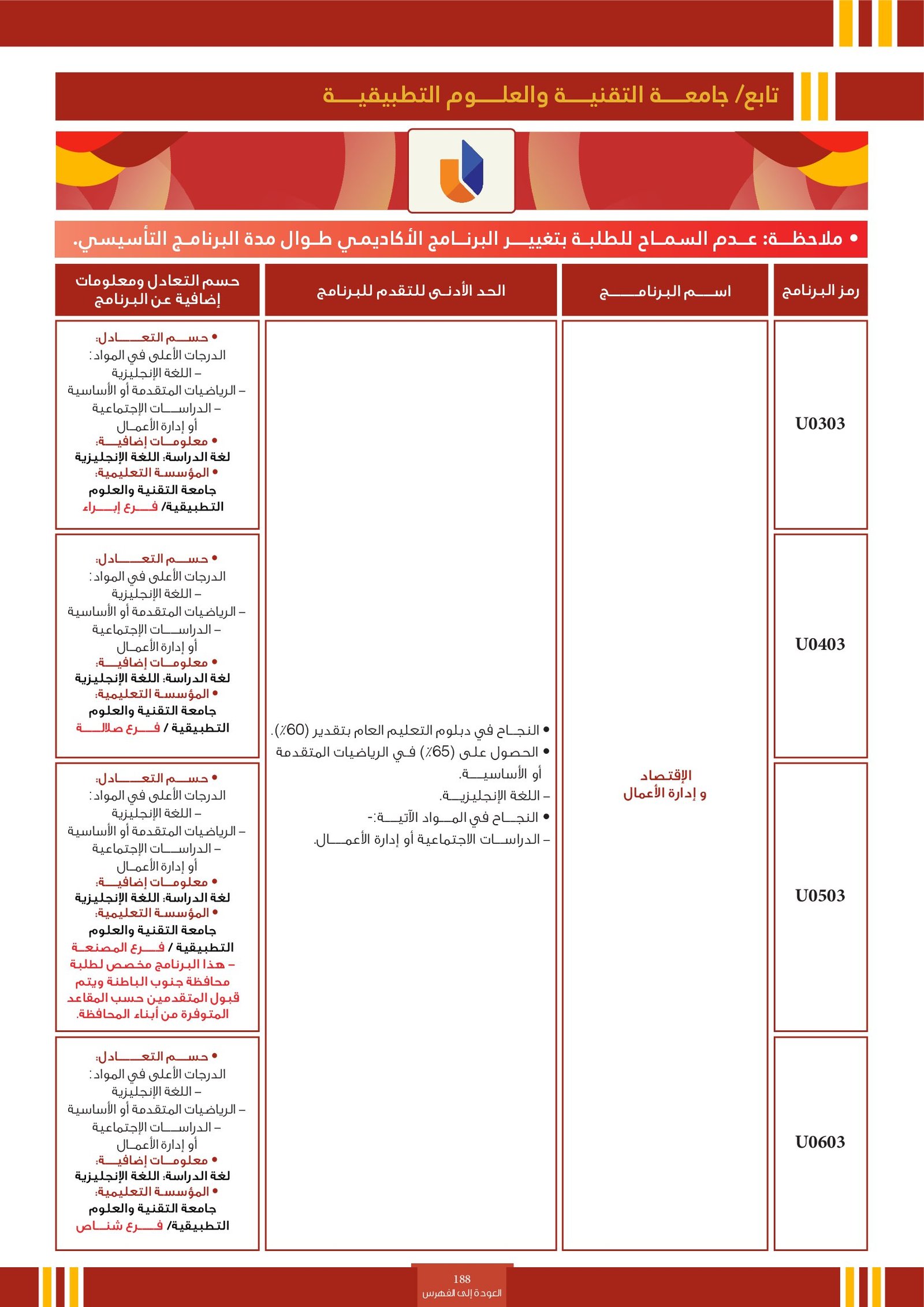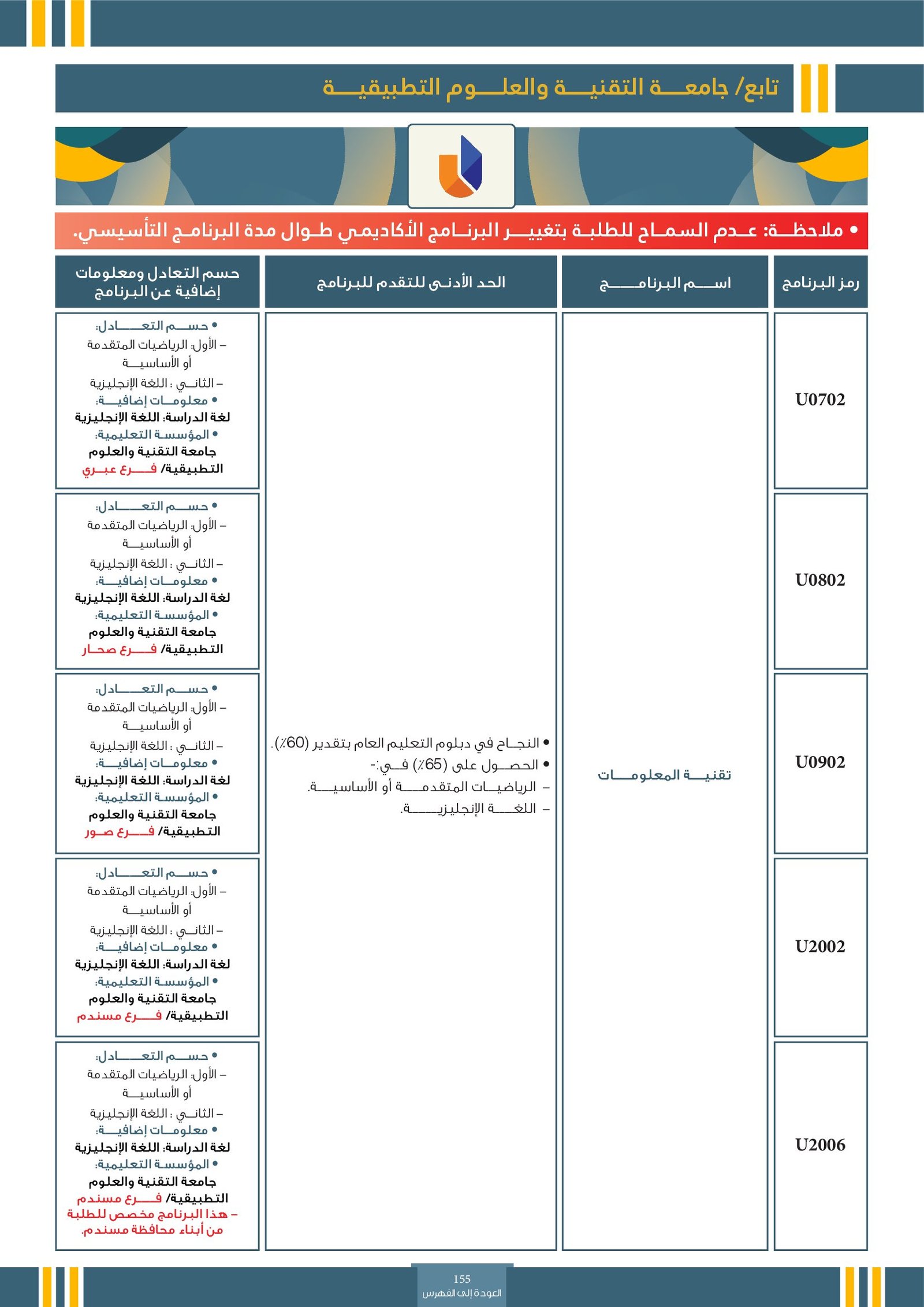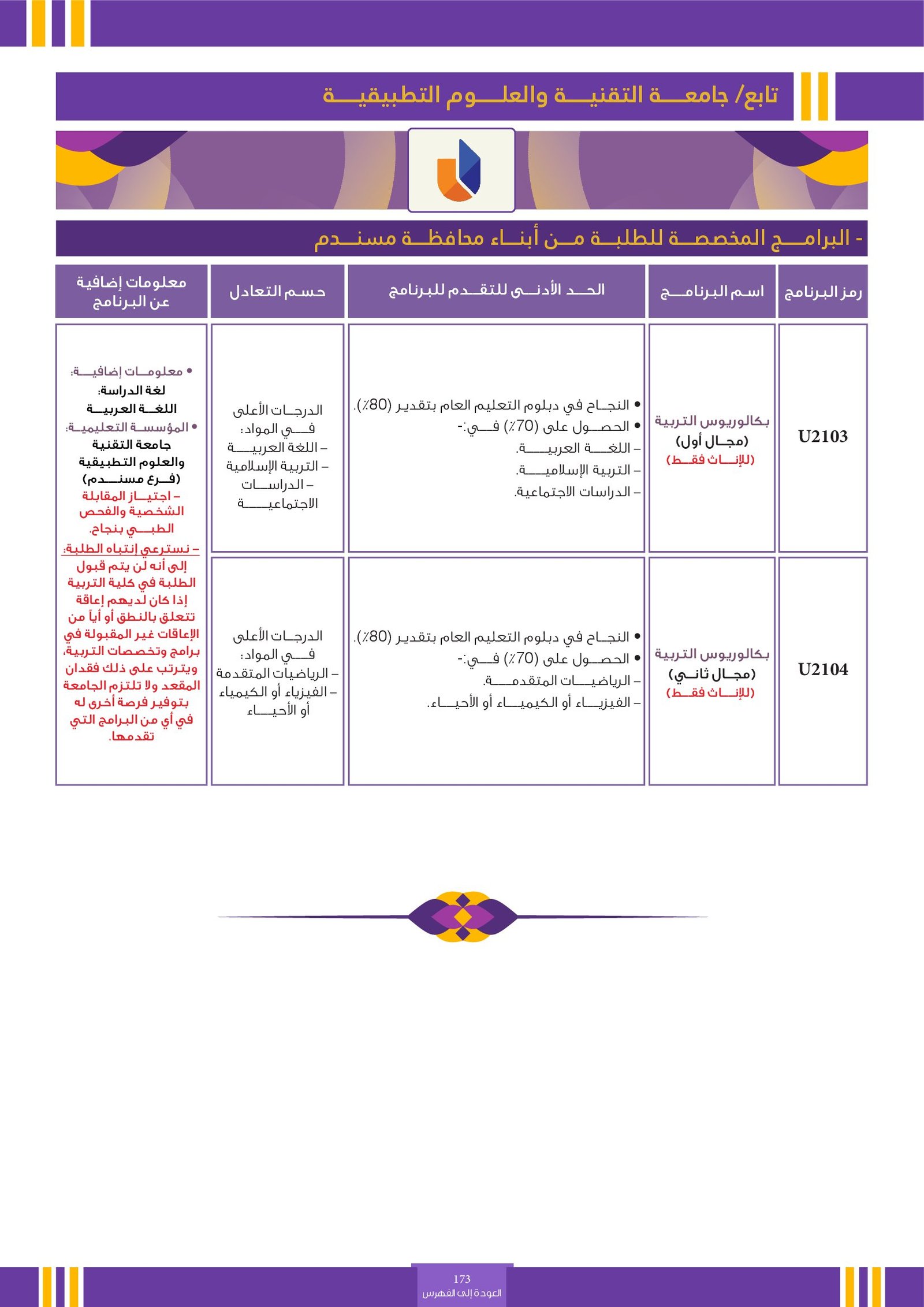 | ..... | البرنامج مخصص للطلبة ذوي الإعاقة في جامعة التقنية والعلوم التطبيقية | البرامج الحكومية | أخرى | جامعة التقنية و العلوم التطبيقية | يرجى الاطلاع على المرجع لمعرفة المزيد من التفاصيل |