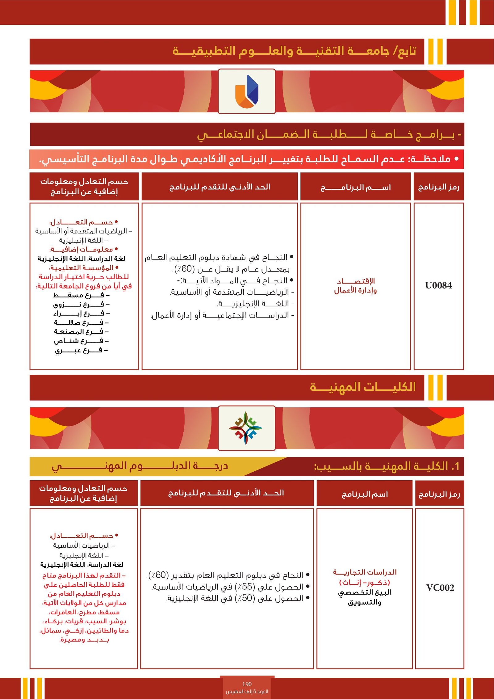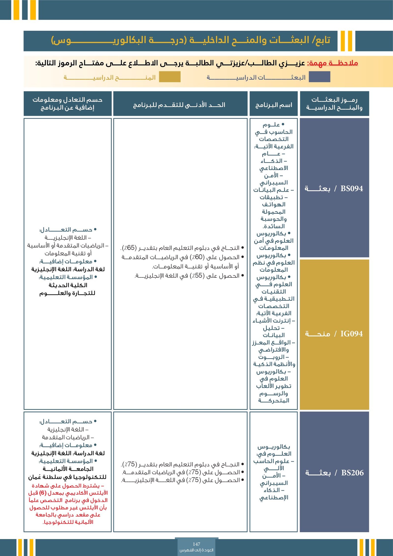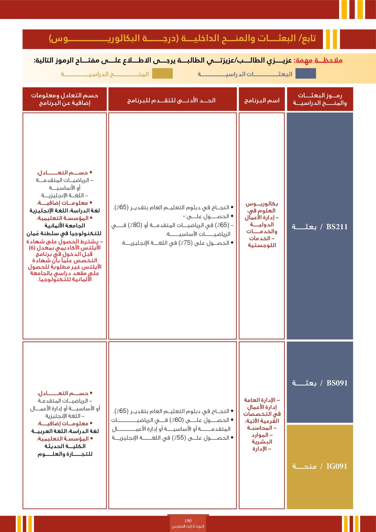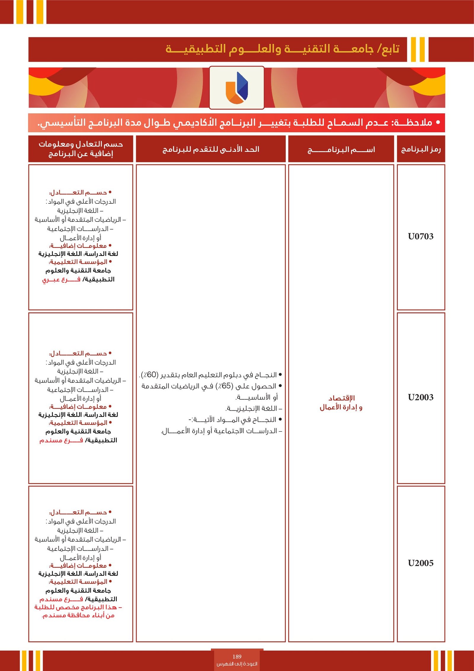 | ..... | البرنامج مخصص للطلبة ذوي الإعاقة في جامعة التقنية والعلوم التطبيقية | البرامج الحكومية | أخرى | جامعة التقنية و العلوم التطبيقية | يرجى الاطلاع على المرجع لمعرفة المزيد من التفاصيل |