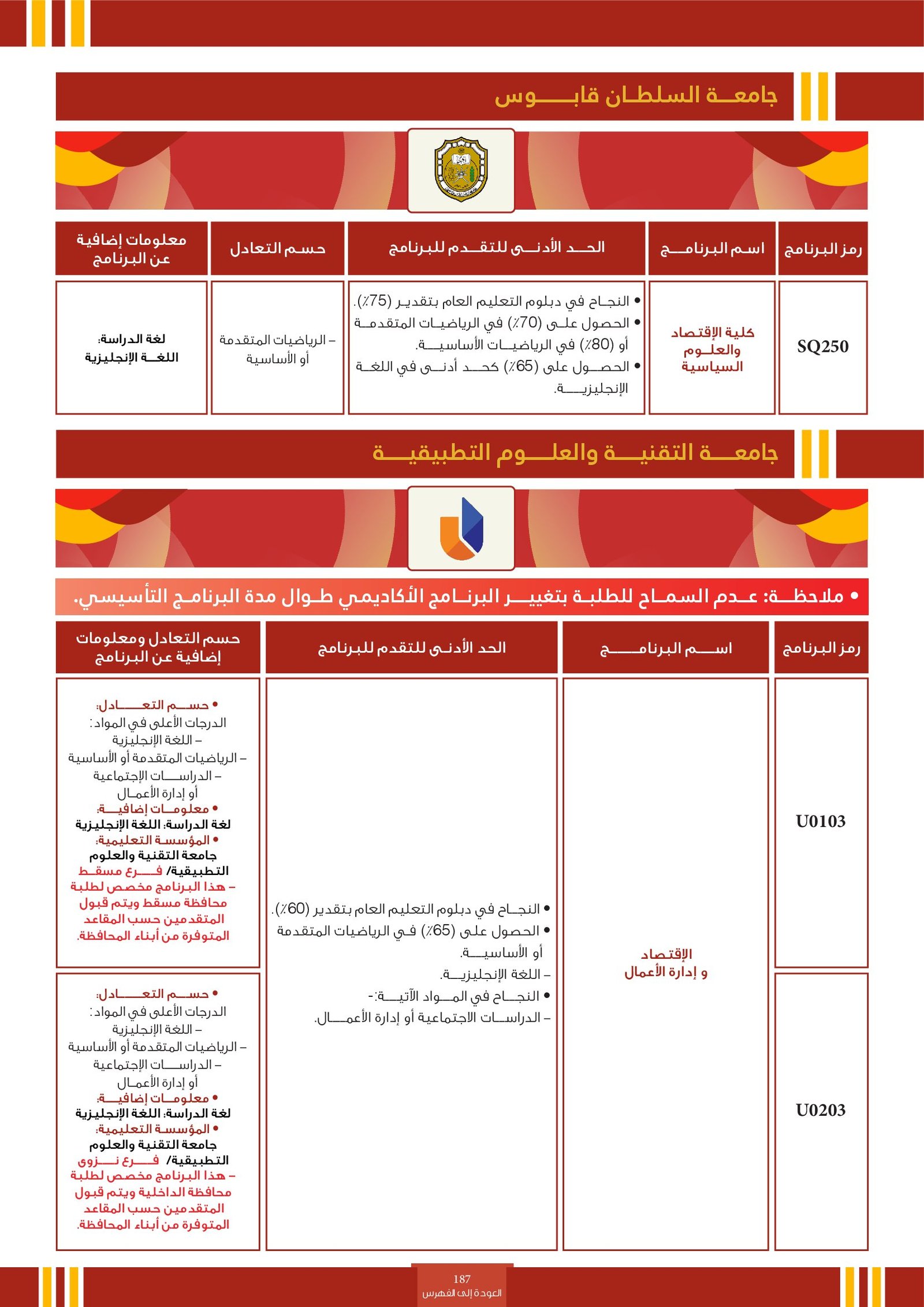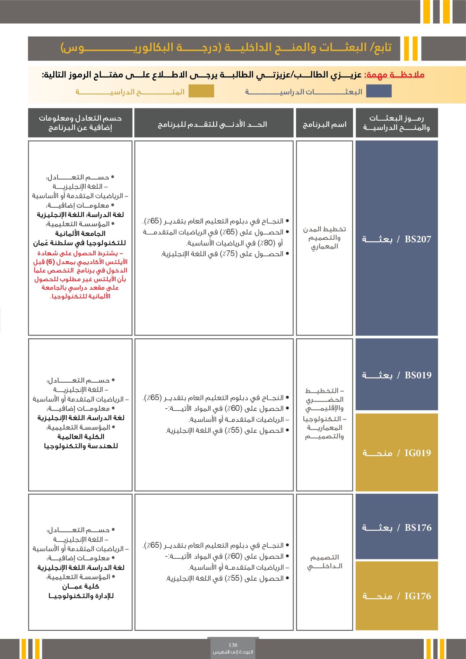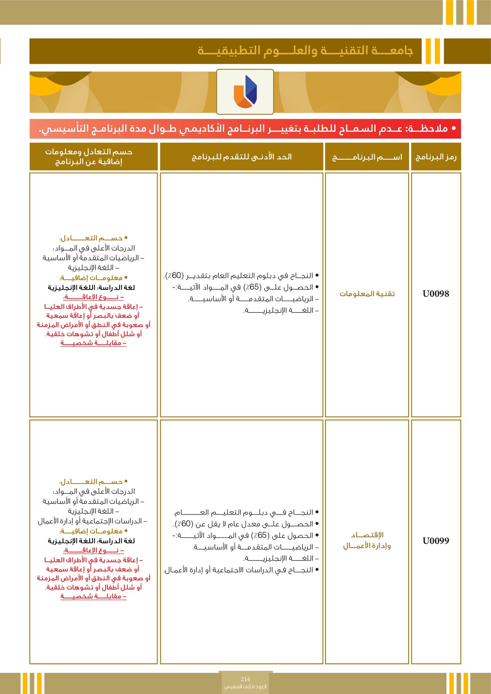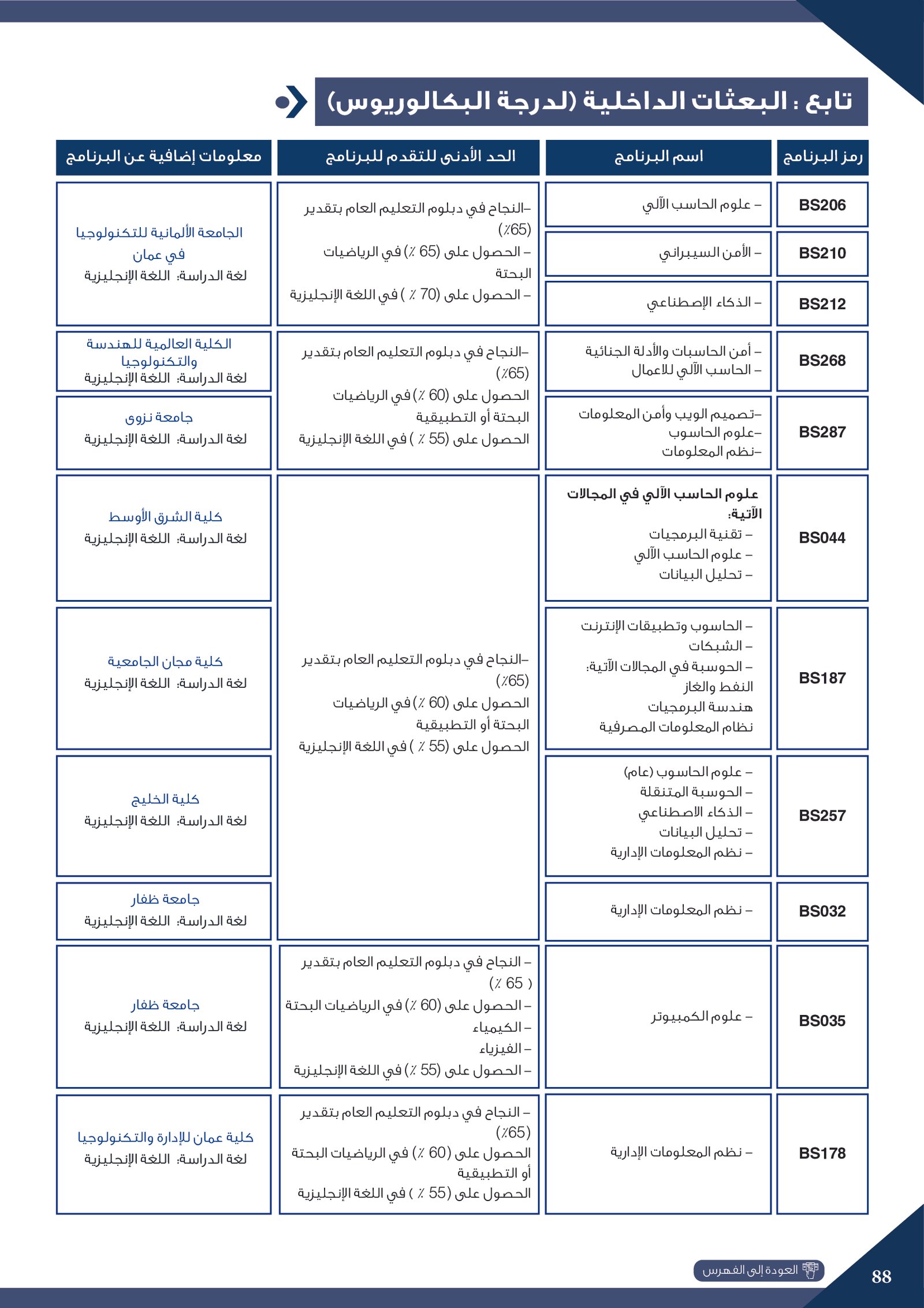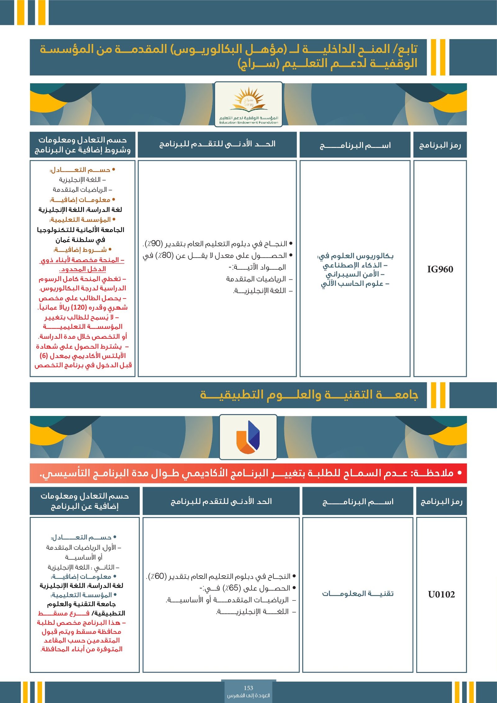 | ..... | البرنامج مخصص للطلبة ذوي الإعاقة في جامعة التقنية والعلوم التطبيقية | البرامج الحكومية | أخرى | جامعة التقنية و العلوم التطبيقية | يرجى الاطلاع على المرجع لمعرفة المزيد من التفاصيل |