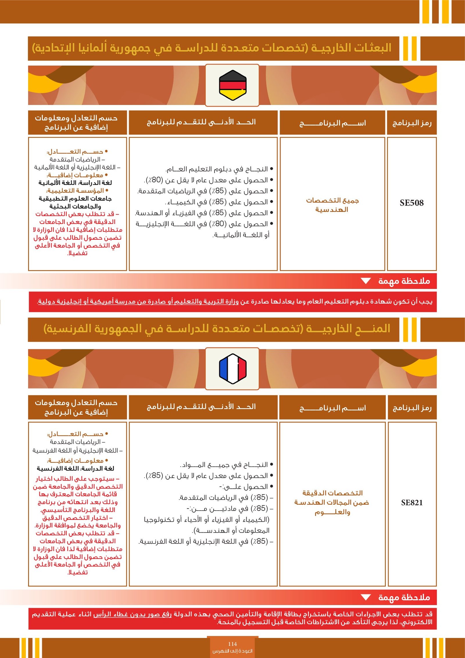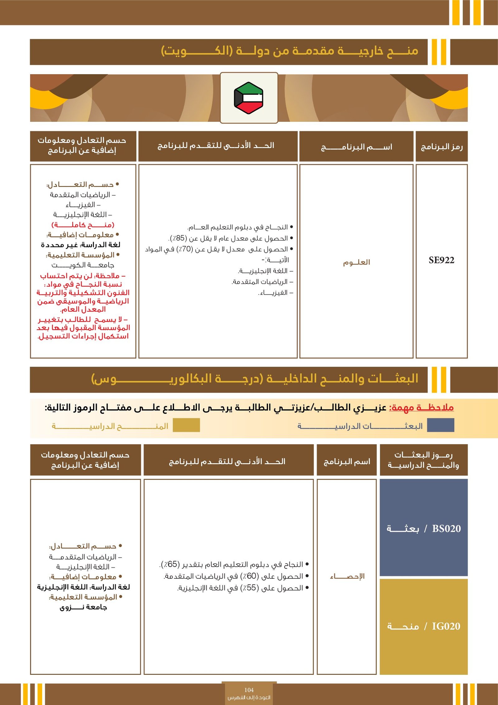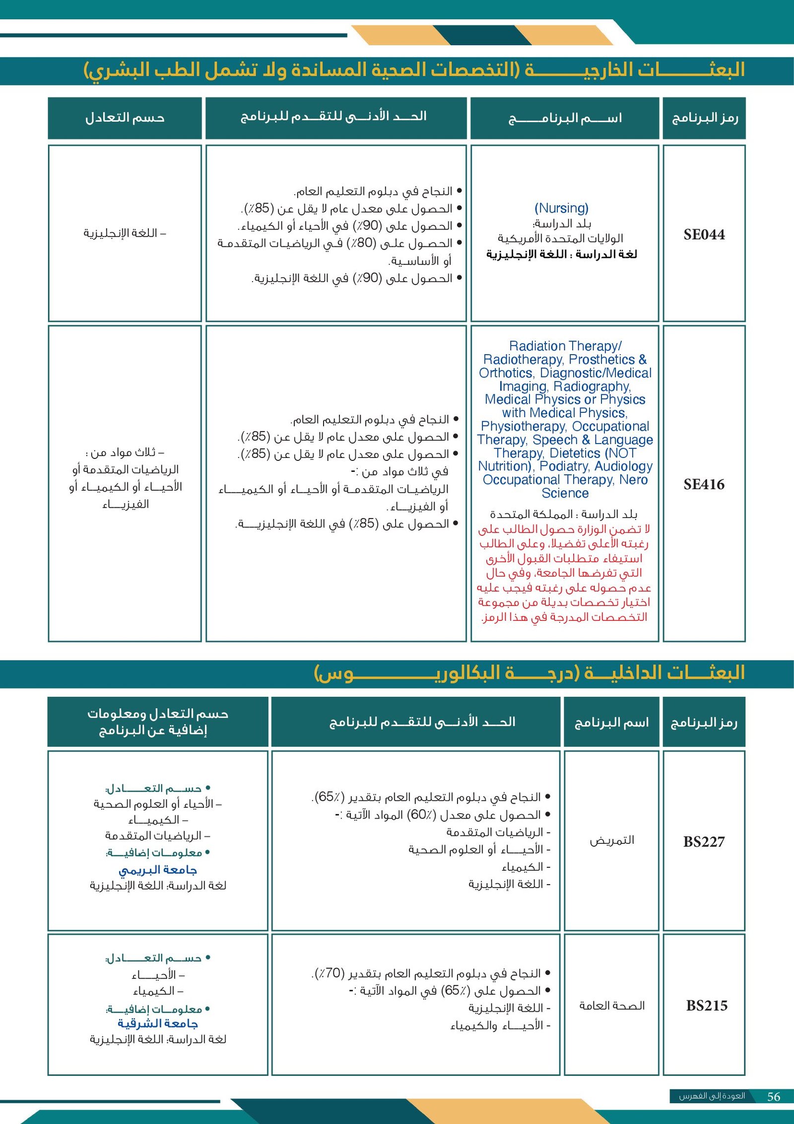 | SE044 | Nursing | البعثات الخارجية | أخرى | التفاصيل بالمرجع | بلد الدراسة : الولايات المتحدة الأمريكية - الرياضيات المتقدمة أو الأسايبة - الأحياء أو الكيمياء |