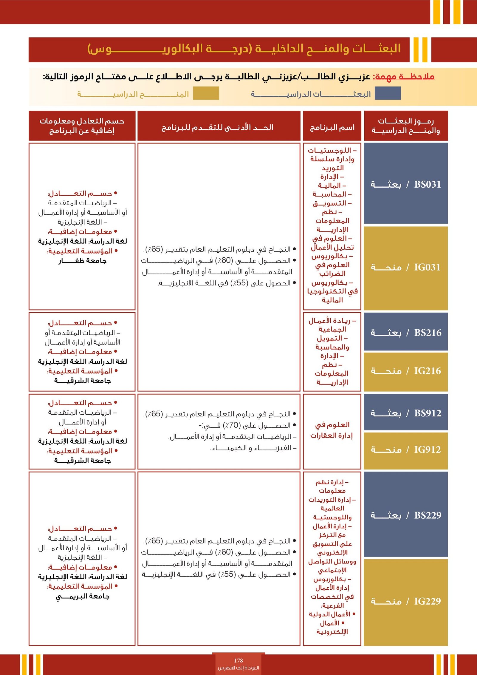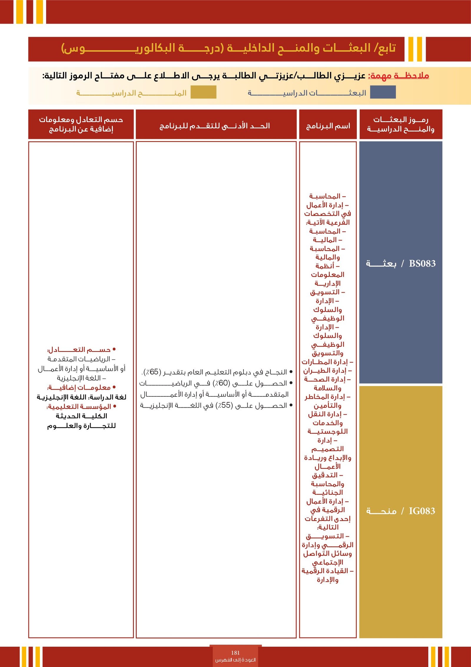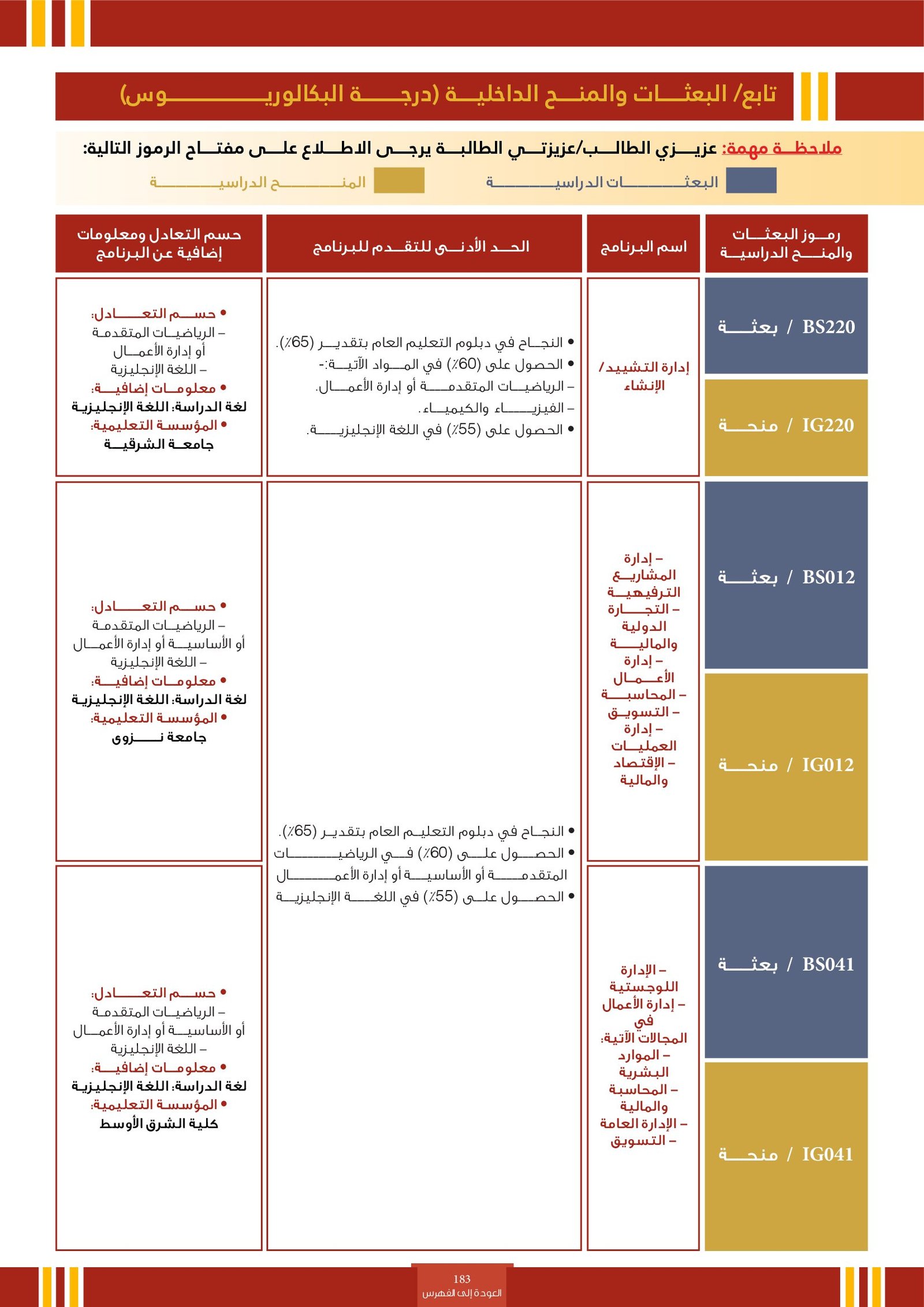 | BS260 | التخصصات الإدارية ( إعاقات جسدية ) | البعثات الداخلية | أخرى | التفاصيل بالمرجع | مجالات دراسية تُعنى بإكساب الطلاب المهارات والمعرفة اللازمة لتنظيم وإدارة الموارد بكفاءة داخل المؤسسات. تشمل مجالات مثل إدارة الأعمال، المحاسبة، الاقتصاد، التمويل، والتسويق، وتهدف إلى إعداد كوادر قادرة على اتخاذ قرارات فعالة وقيادة فرق العمل وتحقيق الأهداف التنظيمية في بيئات العمل المختلفة. |