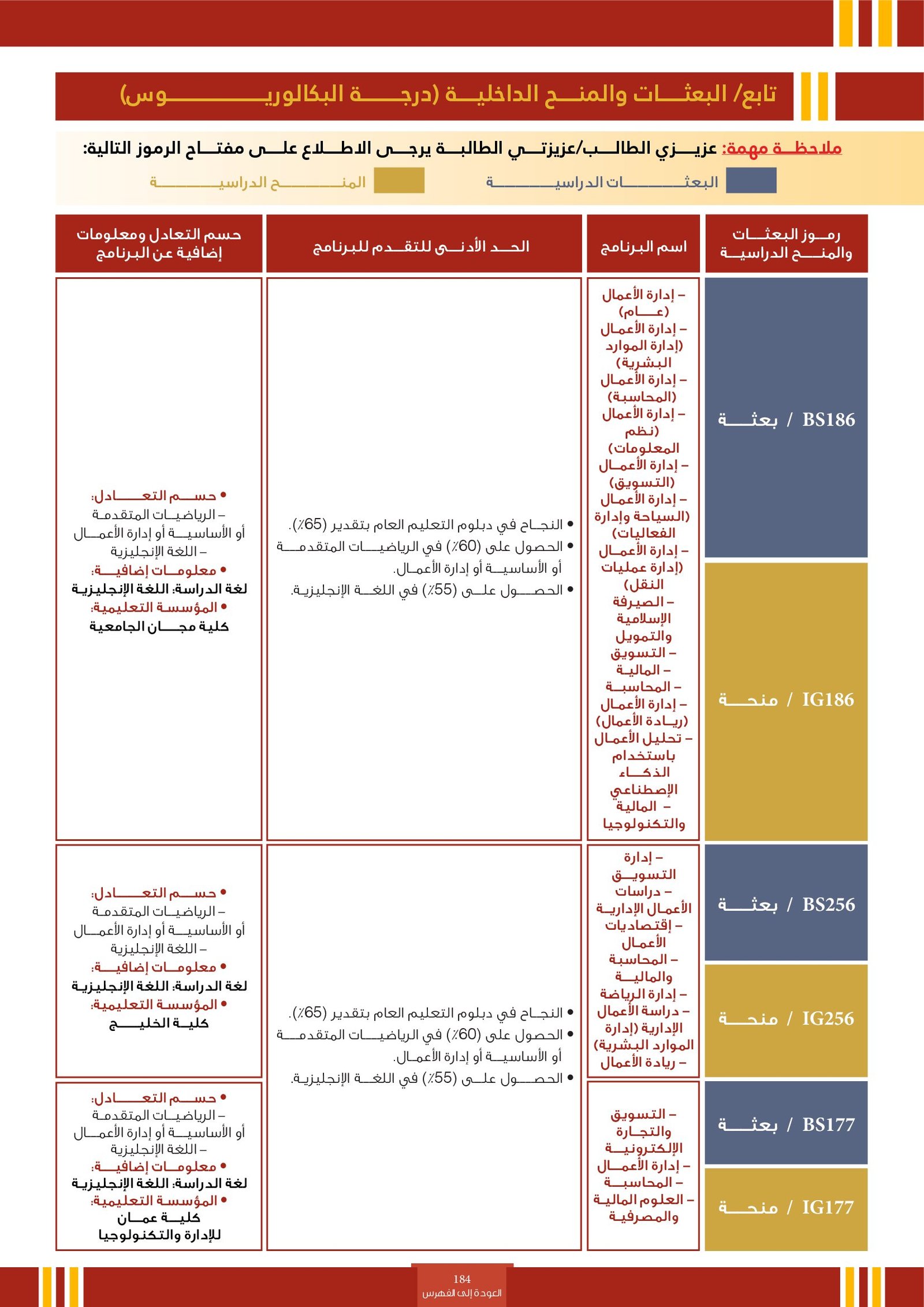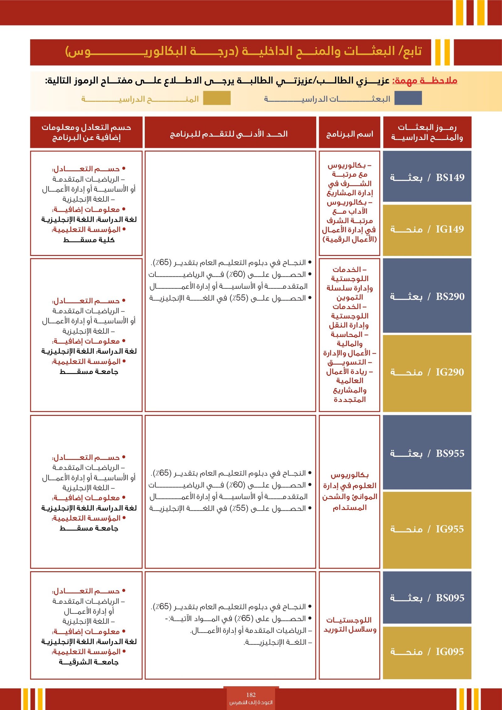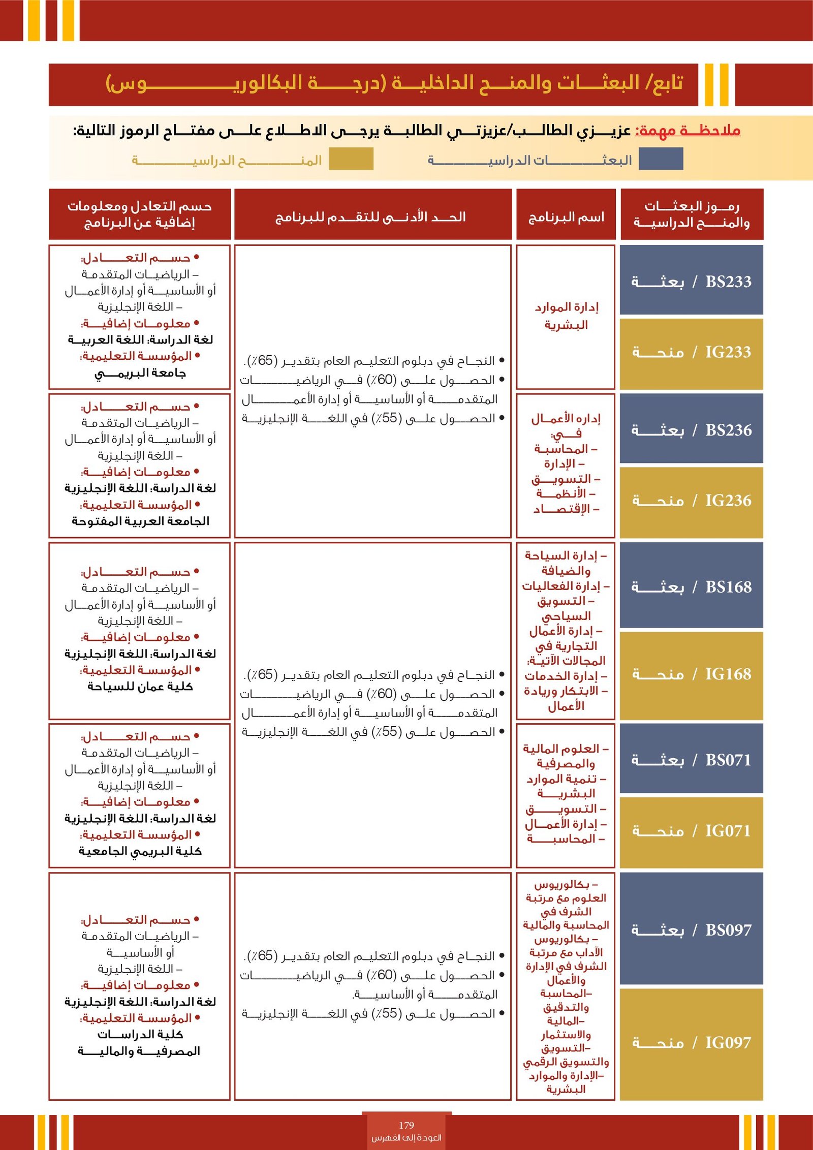 | BS260 | التخصصات الإدارية ( إعاقات جسدية ) | البعثات الداخلية | أخرى | التفاصيل بالمرجع | مجالات دراسية تُعنى بإكساب الطلاب المهارات والمعرفة اللازمة لتنظيم وإدارة الموارد بكفاءة داخل المؤسسات. تشمل مجالات مثل إدارة الأعمال، المحاسبة، الاقتصاد، التمويل، والتسويق، وتهدف إلى إعداد كوادر قادرة على اتخاذ قرارات فعالة وقيادة فرق العمل وتحقيق الأهداف التنظيمية في بيئات العمل المختلفة. |