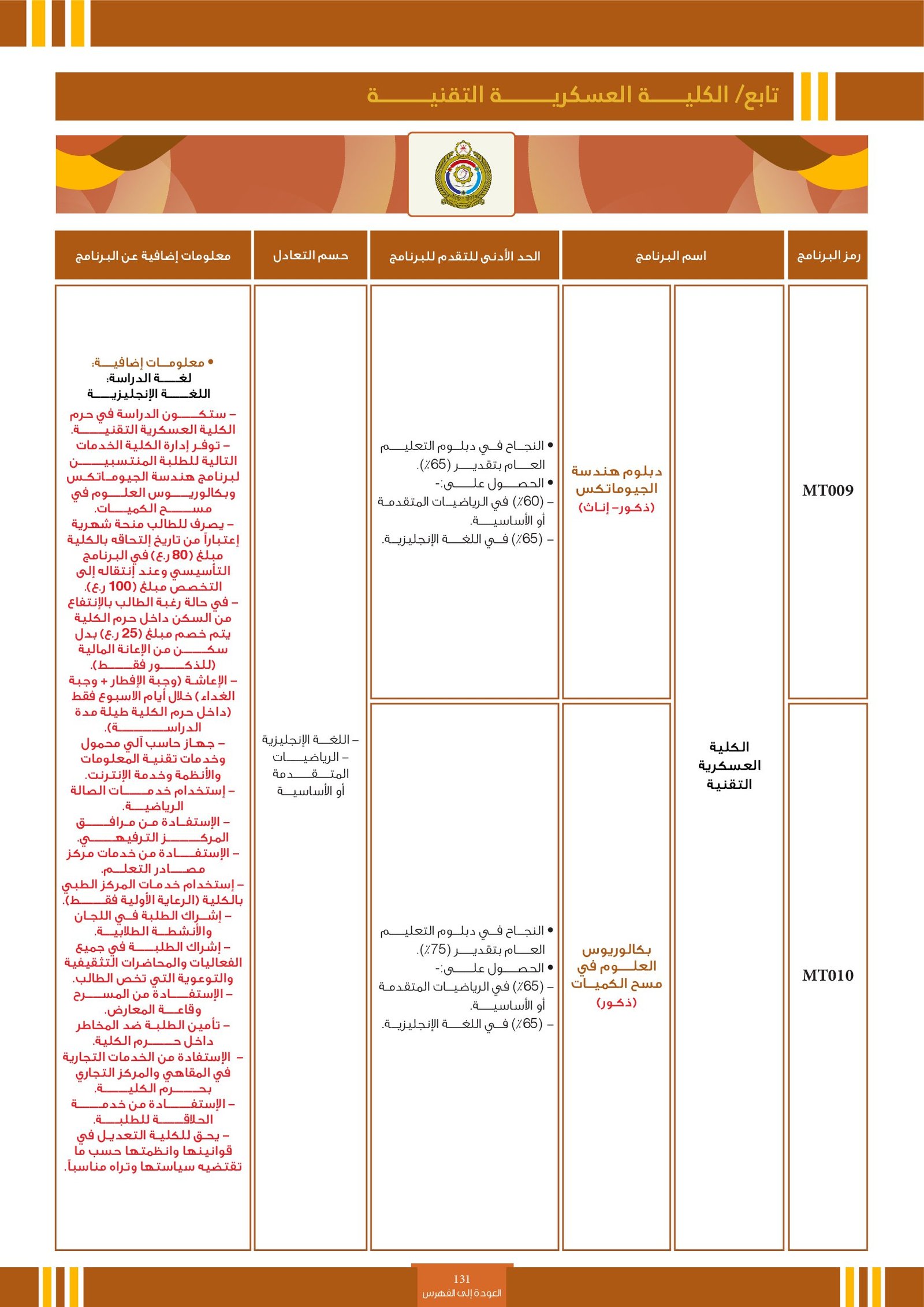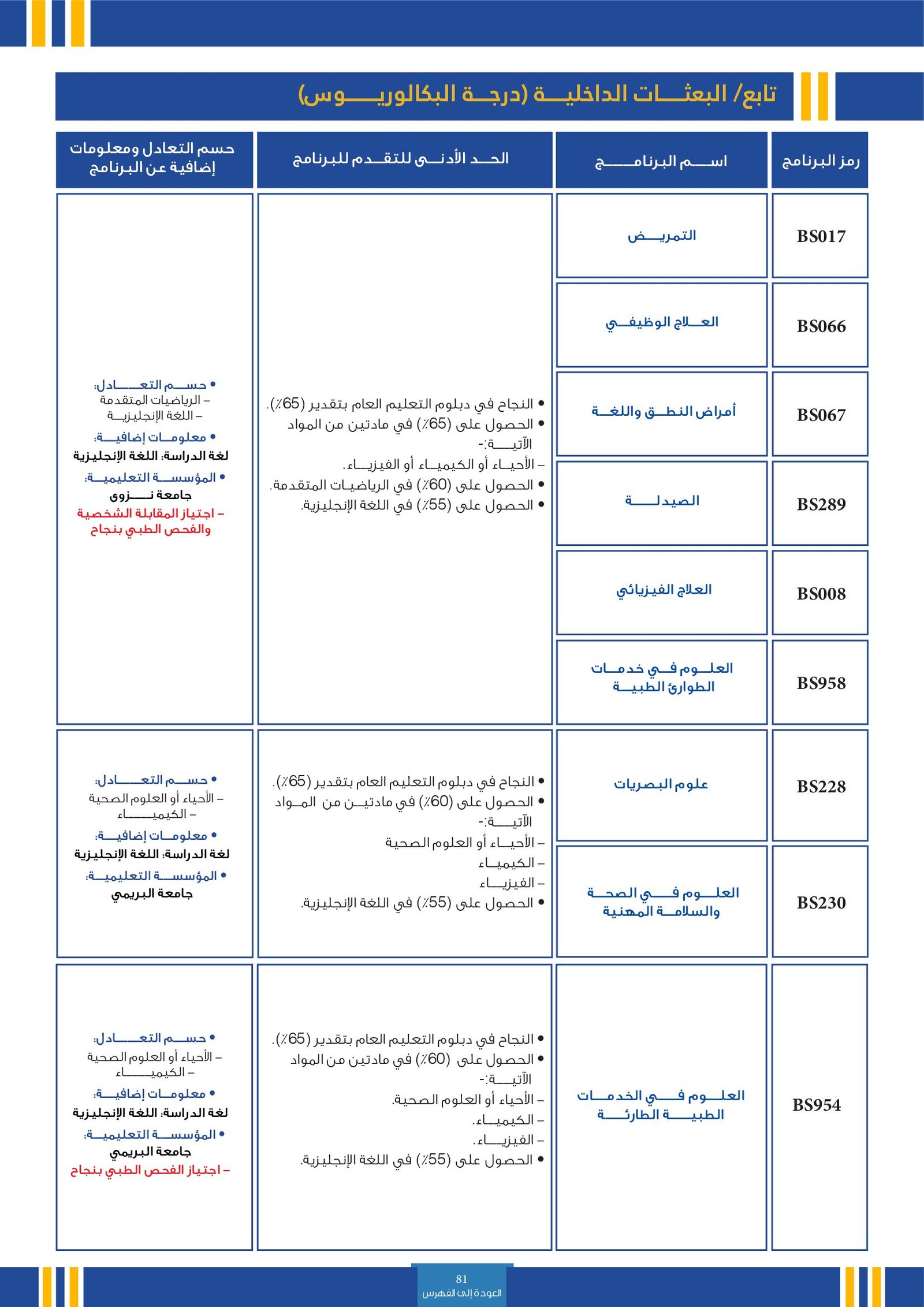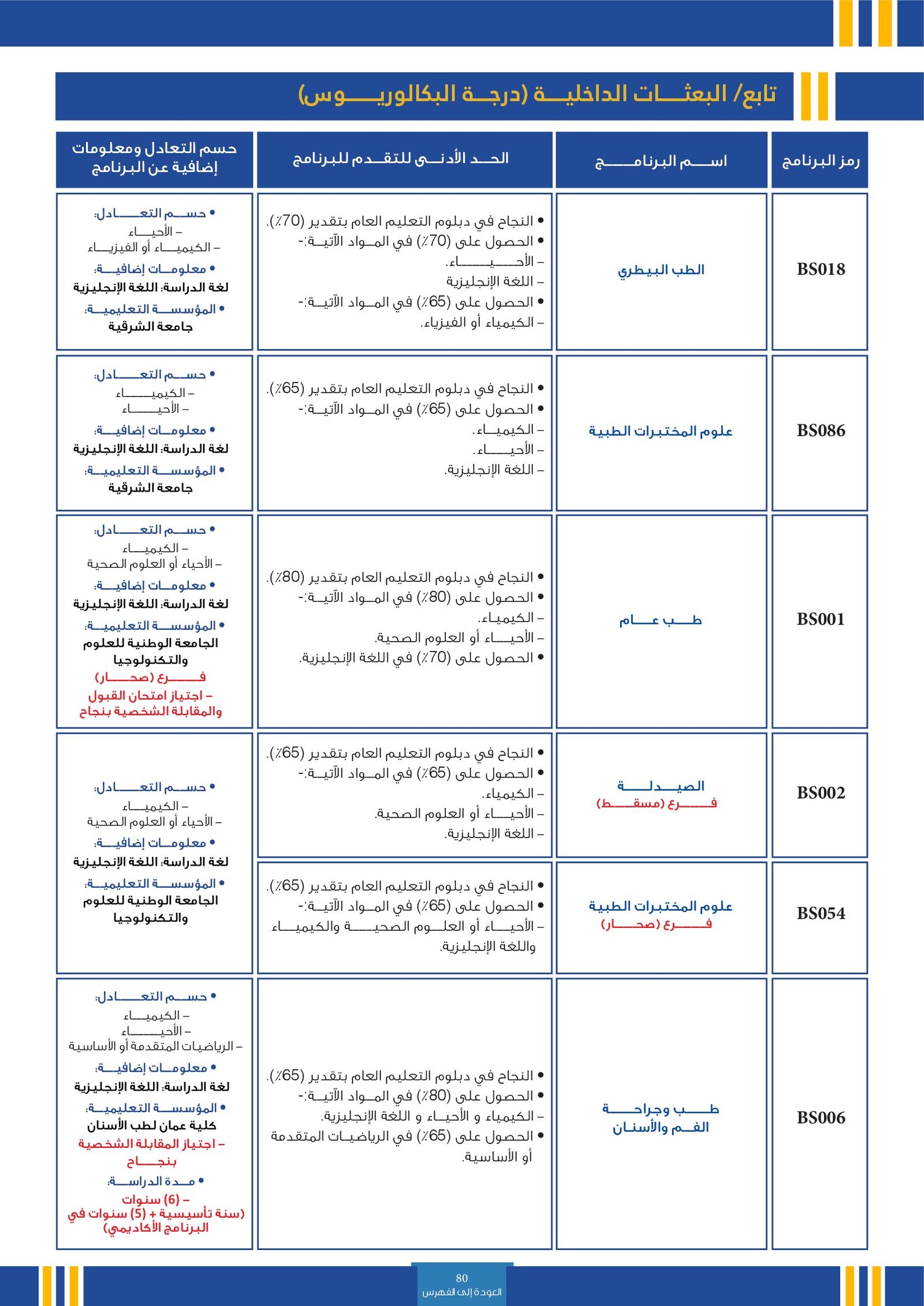 | BS054 | علوم المختبرات الطبية | البعثات الداخلية | أخرى | الجامعة الوطنية للعلوم و التكنولوجيا | للعام الأول. تم تصميم البرنامج لتقديم دوره تدريبية عالية الجودة (MD) وثيقا بدورات برنامج .ضمن مشاركة الخريجين في النظام الصحي بعد تخرجهم