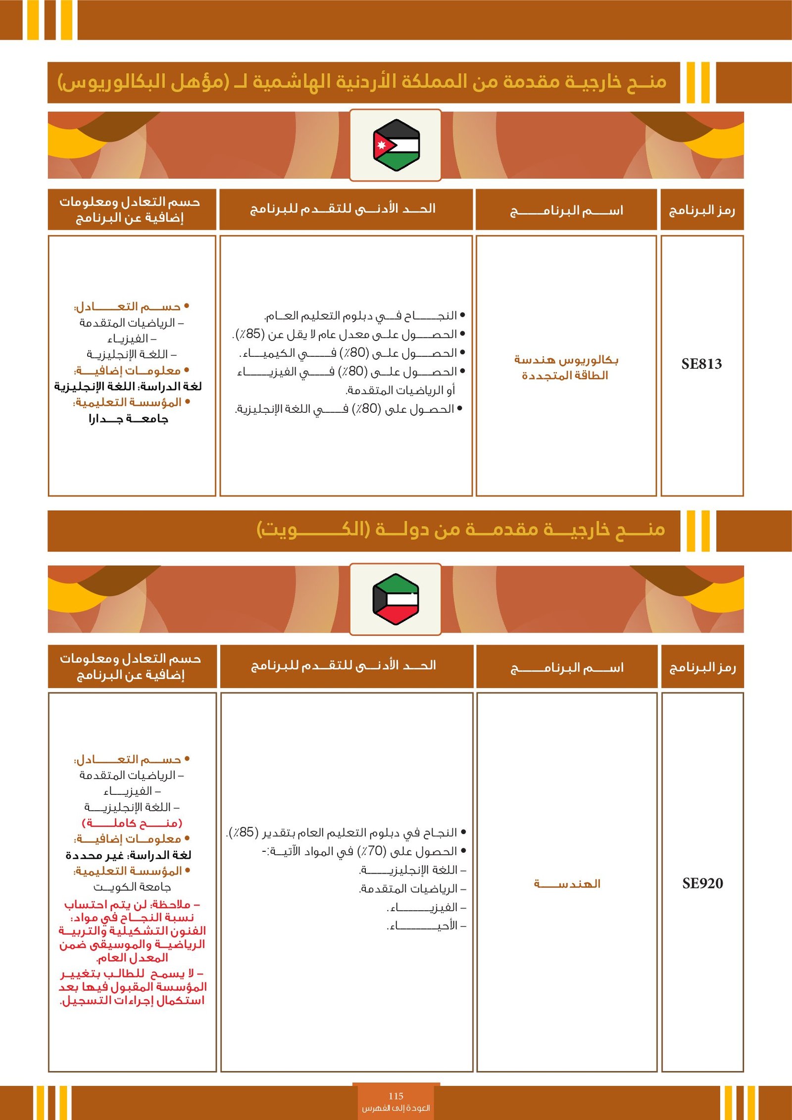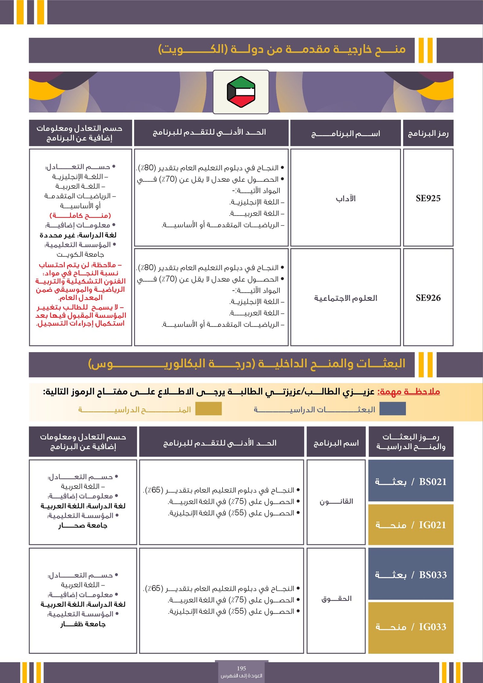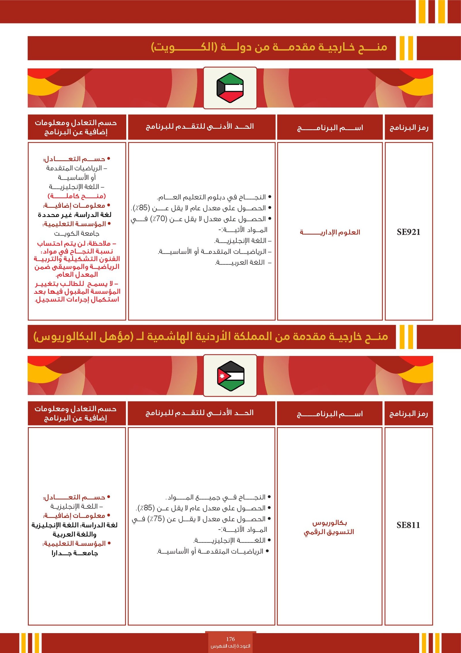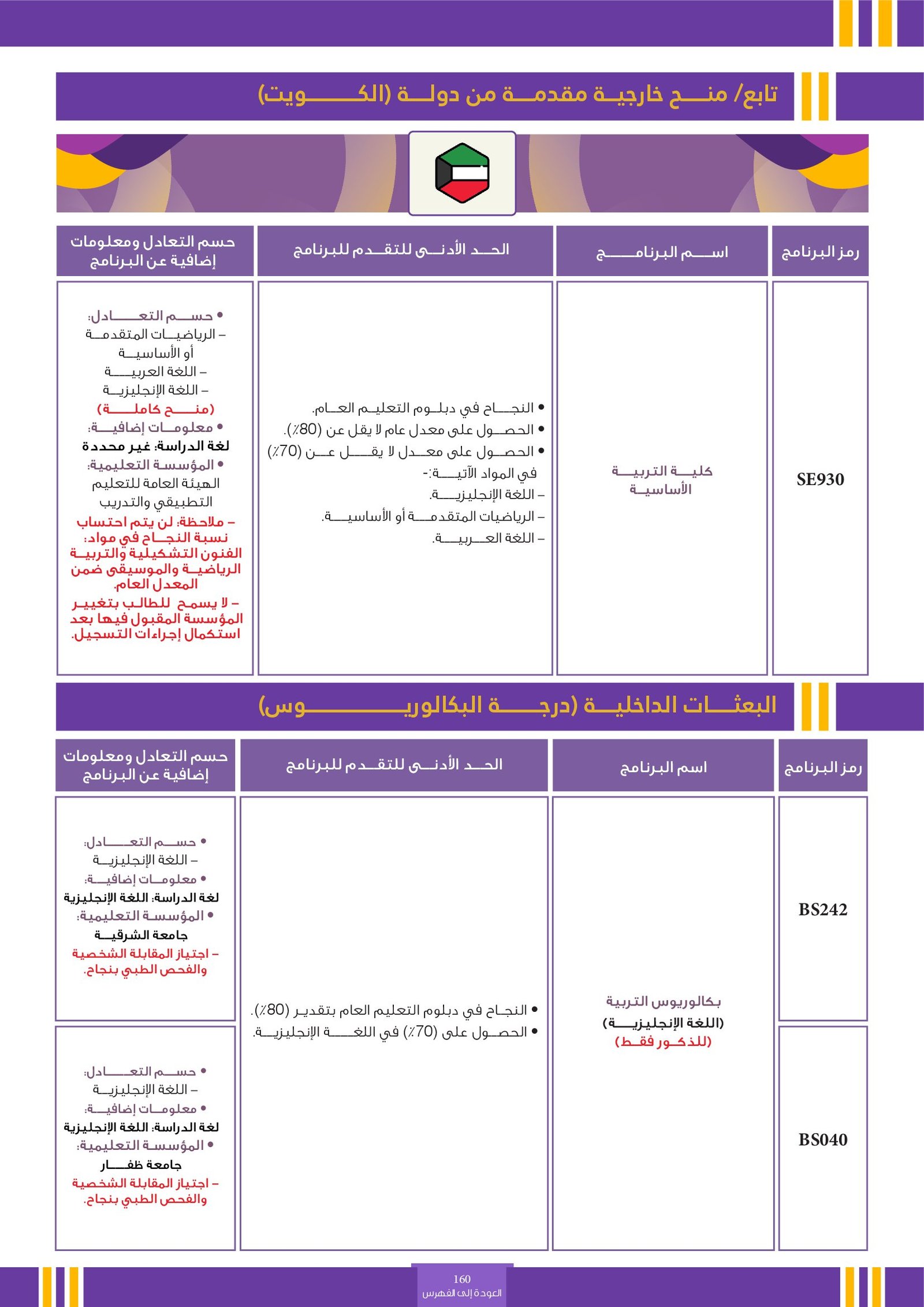 | SE890 | البرنامج مخصص للطلبة ذوي الإعاقة السمعية فقط | البعثات الخارجية | أخرى | التفاصيل بالمرجع | البرنامج مخصص للطلبة ذوي الإعاقة السمعية فقط SCHOLARSHIPS FOR DEAF STUDENTS بلد الدراسة : الأردن المؤسسة التعليمية : الجامعة الأردنية - يمكن للطالب الحاصل على البعثة الدراسية اختيار التخصص الذي يرغب بدراسته في الجامعة، عدا التخصصات التربوية. - يخضع اختيار الطالب للبرنامج الدراسي لموافقة الوزارة أولاً، ولا يمكن للوزارة ان تضمن القبول النهائي للطالب في البرنامج الذي قام باختياره حيث ان القبول يعتمد على قدرات الطالب ومدى استيفاءه لمتطلبات ذلك البرنامج |