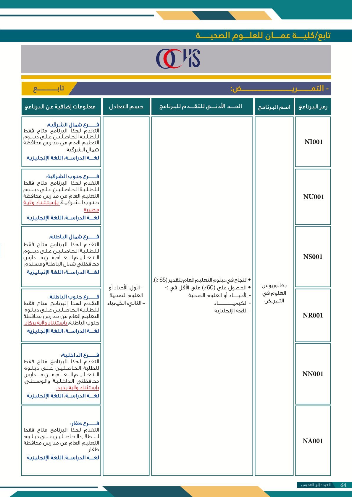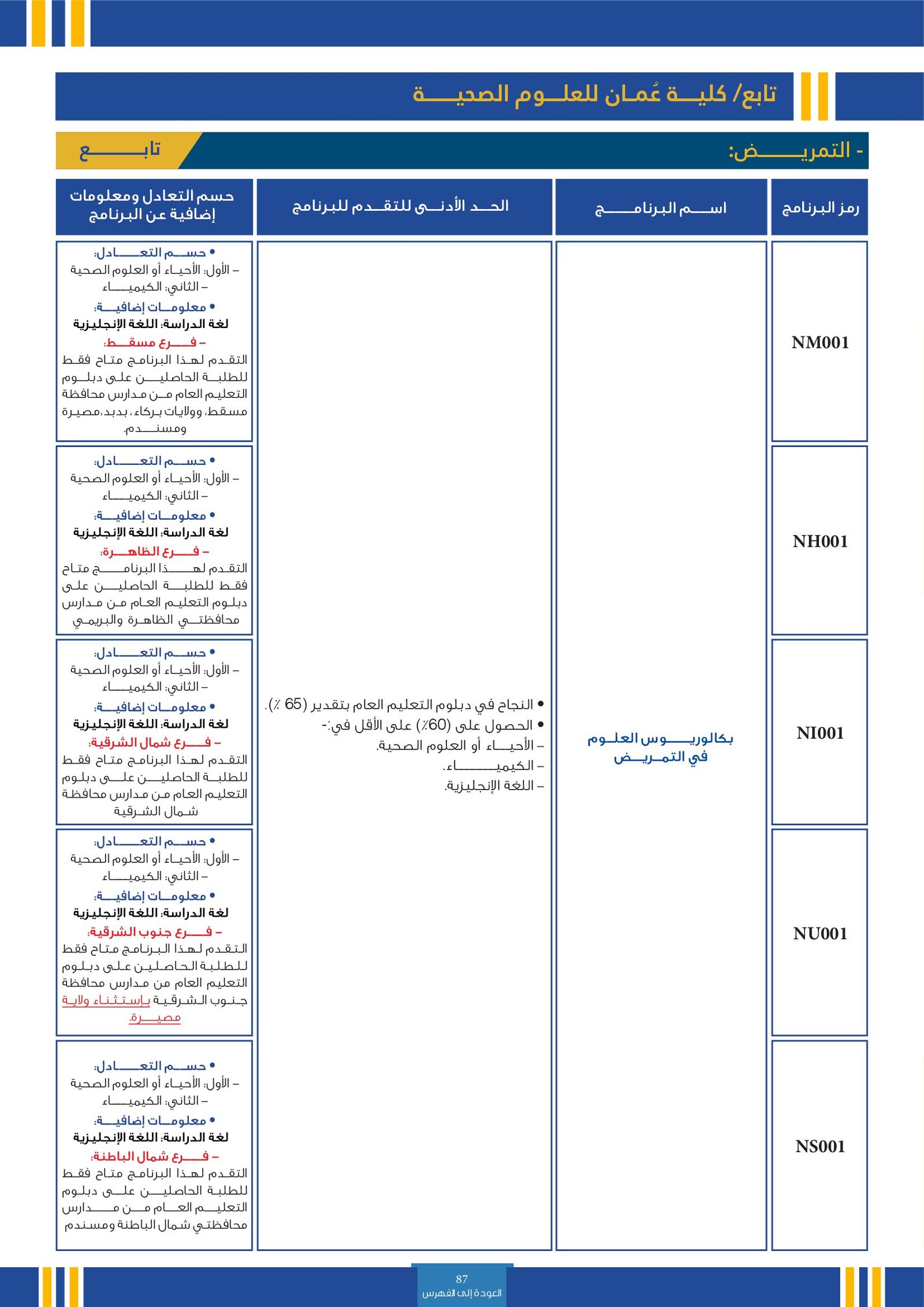 | BS227 | التمريض | البعثات الداخلية | أخرى | جامعة البريمي | ويمكن لخريجي التمريض العمل في أماكن الرعاية الصحية الاوليه والثانوية والثالثية. ويمكنها ان تؤدي دورا هاما في التاثير علي نتائج الرعاية الصحية في المستشفيات. الاضافه إلى ذلك، يمكنهم