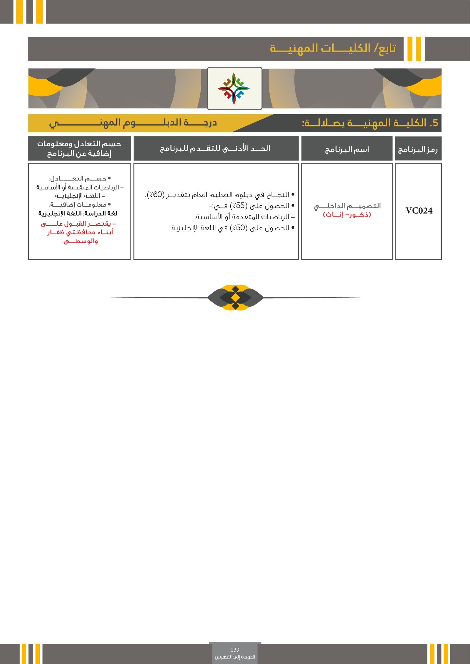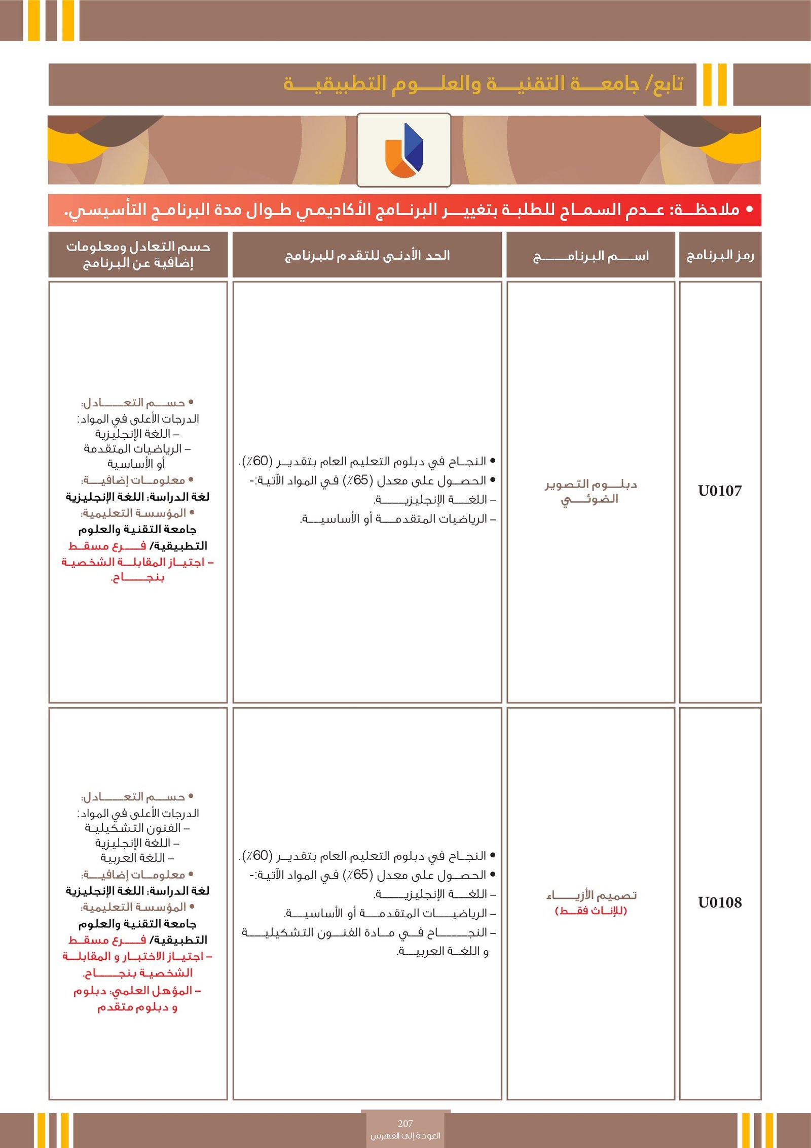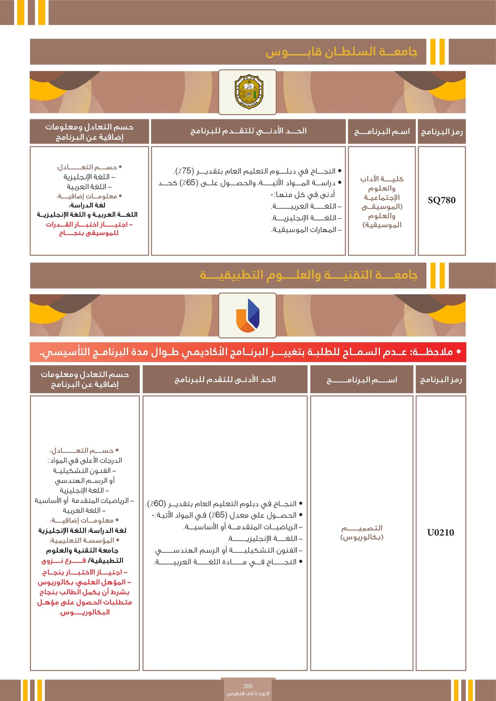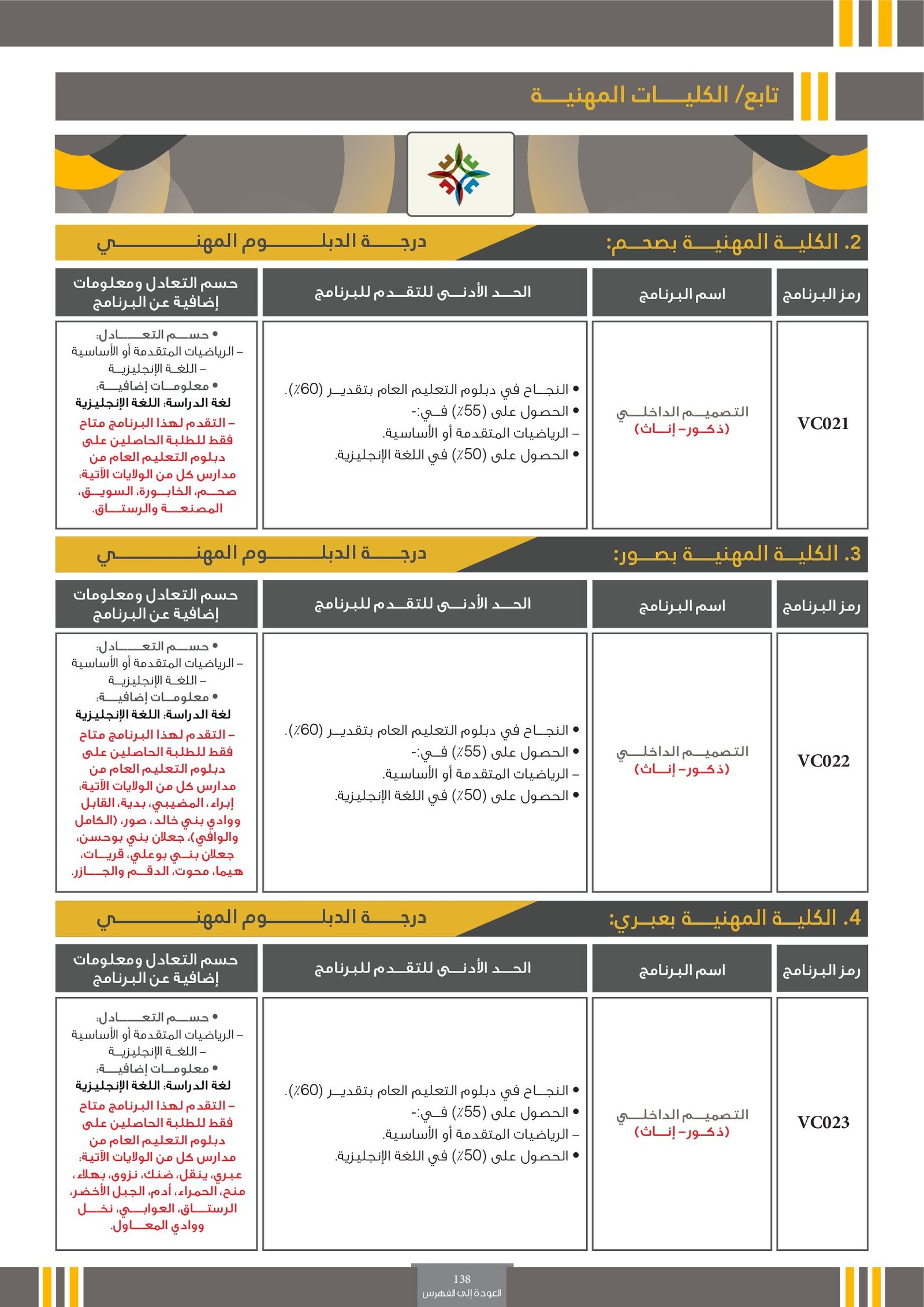 | U0210 | التصميم | البرامج الحكومية | أخرى | جامعة التقنية و العلوم التطبيقية | مجال إبداعي يهتم بابتكار وتطوير حلول بصرية ووظيفية تلبي احتياجات الأفراد والمجتمعات في مختلف المجالات مثل التصميم الجرافيكي، تصميم المنتجات، تصميم الأزياء، وتصميم الوسائط الرقمية. يجمع التخصص بين الفن والتقنية، ويركز على فهم المستخدم والسياق لتحقيق تواصل بصري فعال وجذاب. يزود الطالب بالمهارات اللازمة لاستخدام الأدوات الرقمية والتقليدية لإنتاج تصاميم مبتكرة تعبر عن أفكار ورسائل واضحة تلبي متطلبات السوق والبيئة المحيطة. |