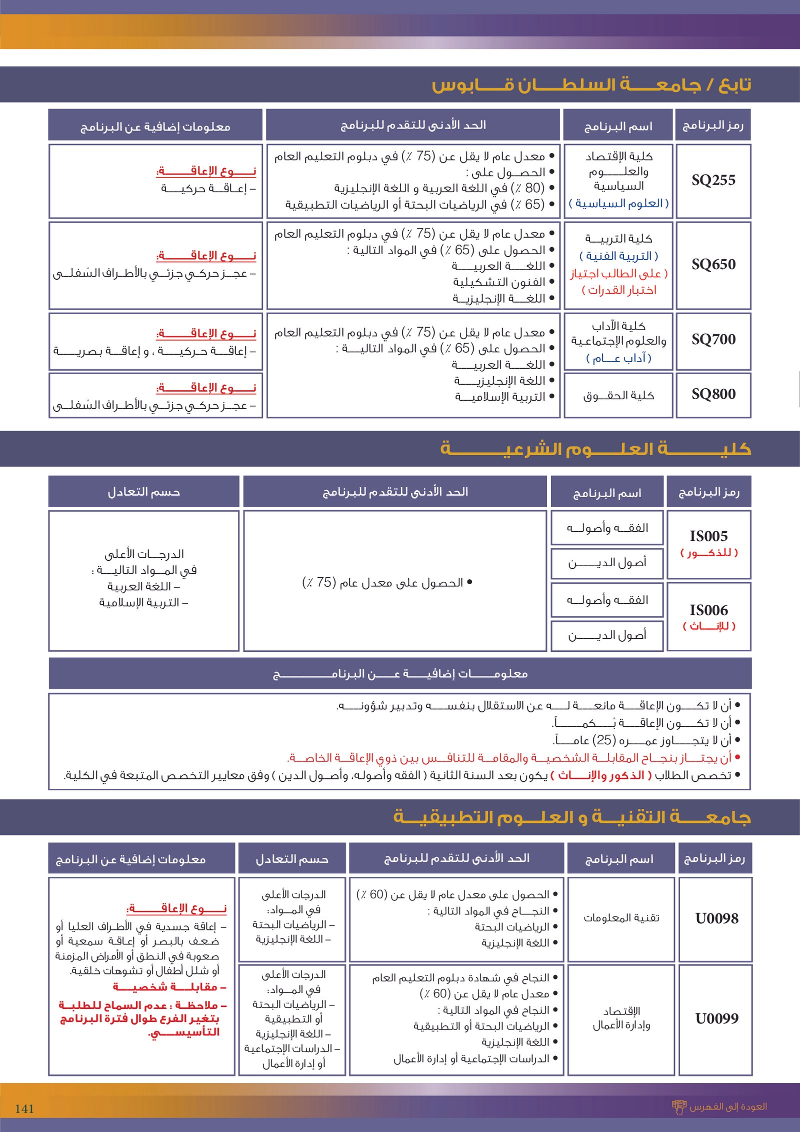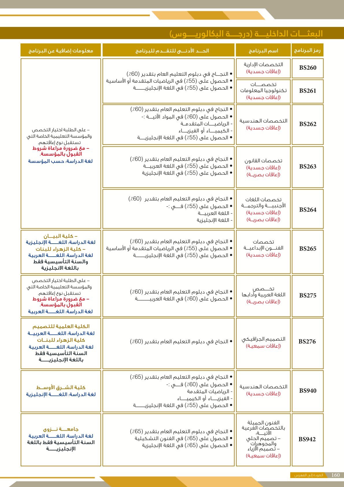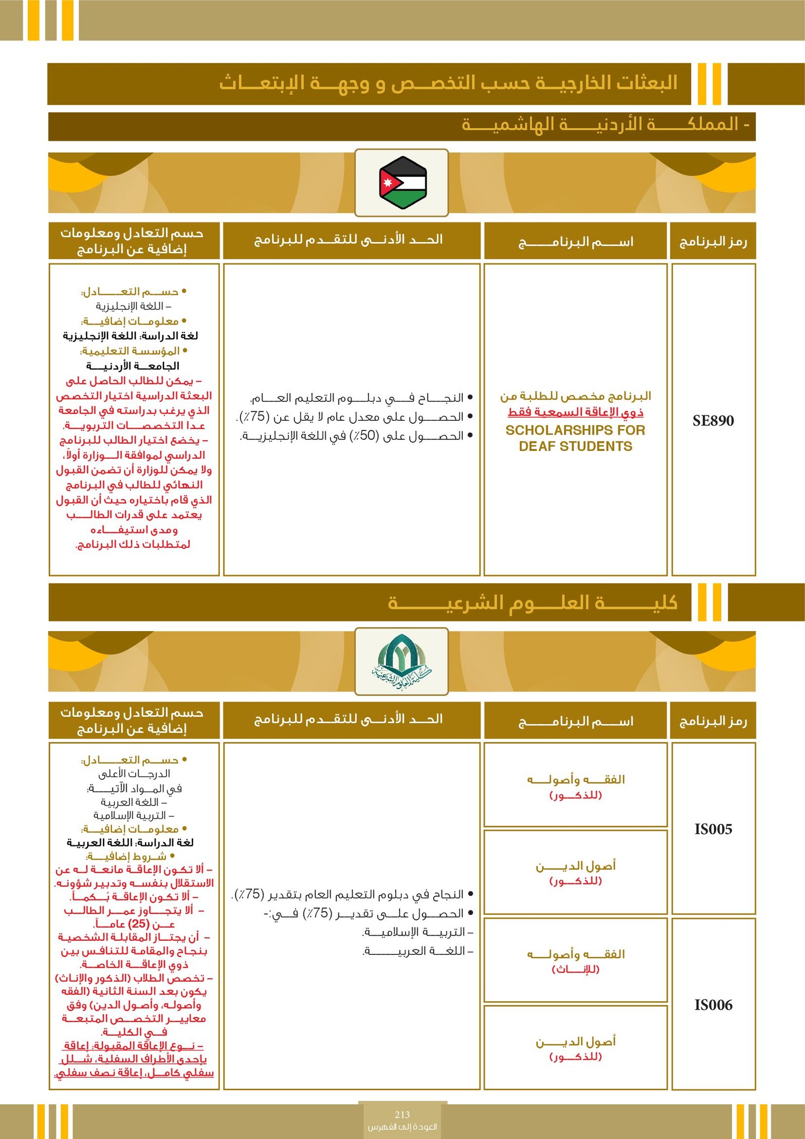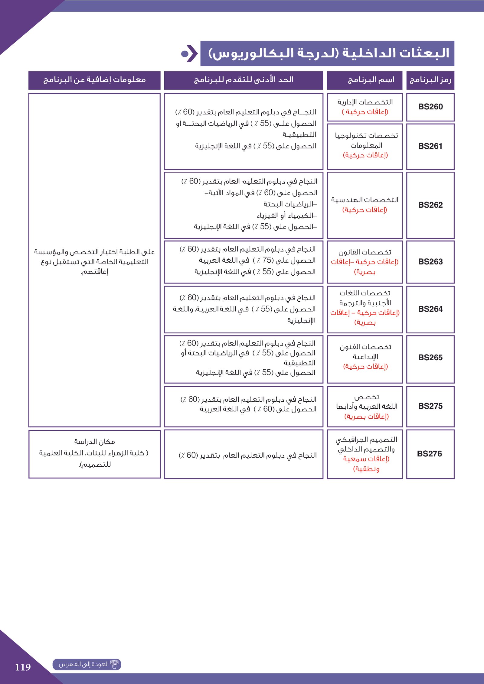 | .... | تخصصات ذوي الاعاقة في كلية العلوم الشرعية | البرامج الحكومية | أخرى | كلية العلوم الشرعية | يرجى الاطلاع على المرجع لمعرفة المزيد من التفاصيل |