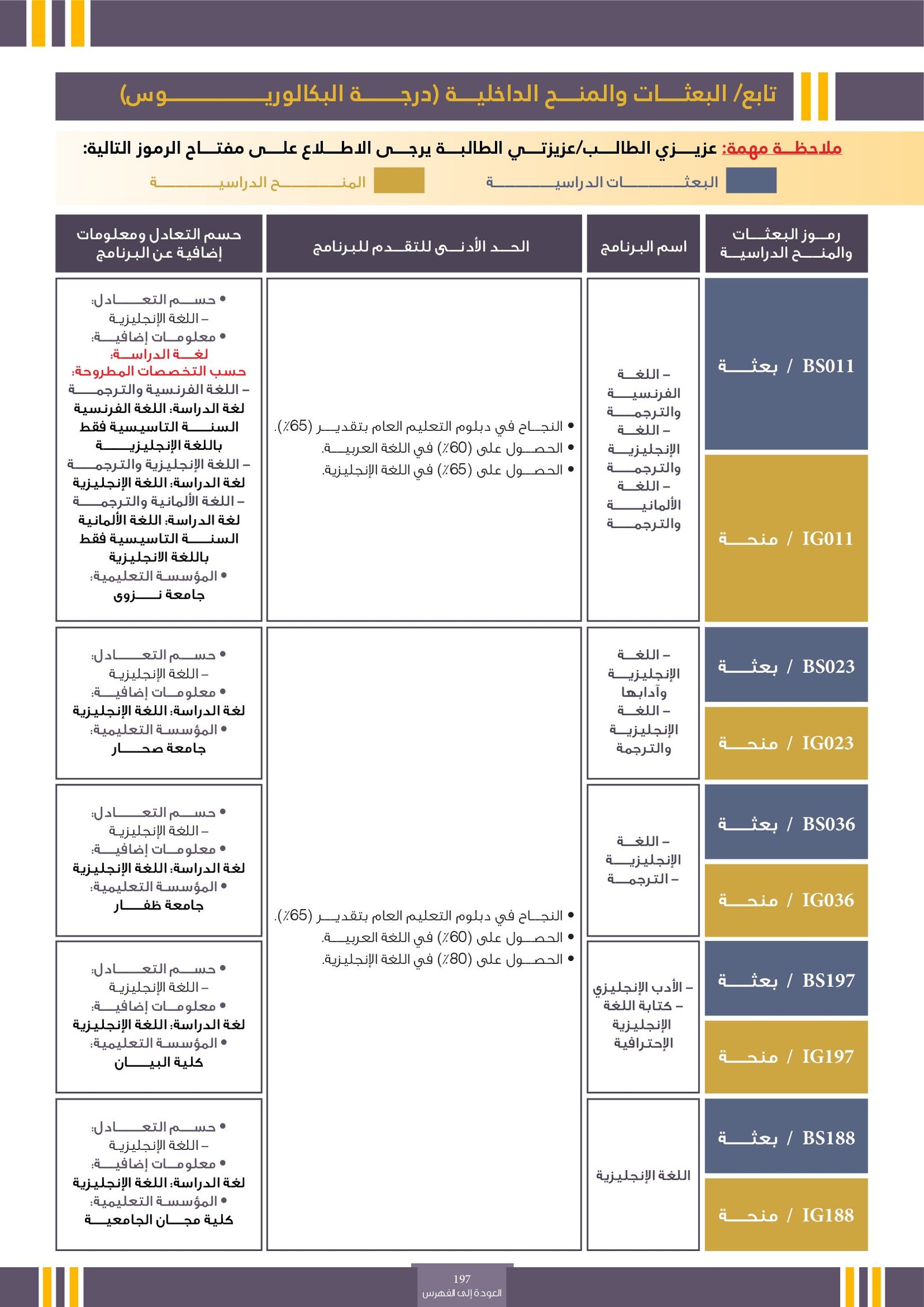 | BS264 | تخصصات اللغات الأجنبية والترجمة ( إعاقات جسدية / بصرية ) | البعثات الداخلية | أخرى | التفاصيل بالمرجع | مجال يهتم بدراسة لغات عالمية مثل الإنجليزية، الفرنسية، الإسبانية وغيرها، مع التركيز على مهارات الترجمة الشفوية والتحريرية بين هذه اللغات واللغة العربية. يهدف التخصص إلى تمكين الطلاب من التواصل الفعّال بين الثقافات، ونقل المعاني بدقة واحترافية، مما يؤهلهم للعمل في مجالات مثل الترجمة، التعليم، الإعلام، والعلاقات الدولية. |