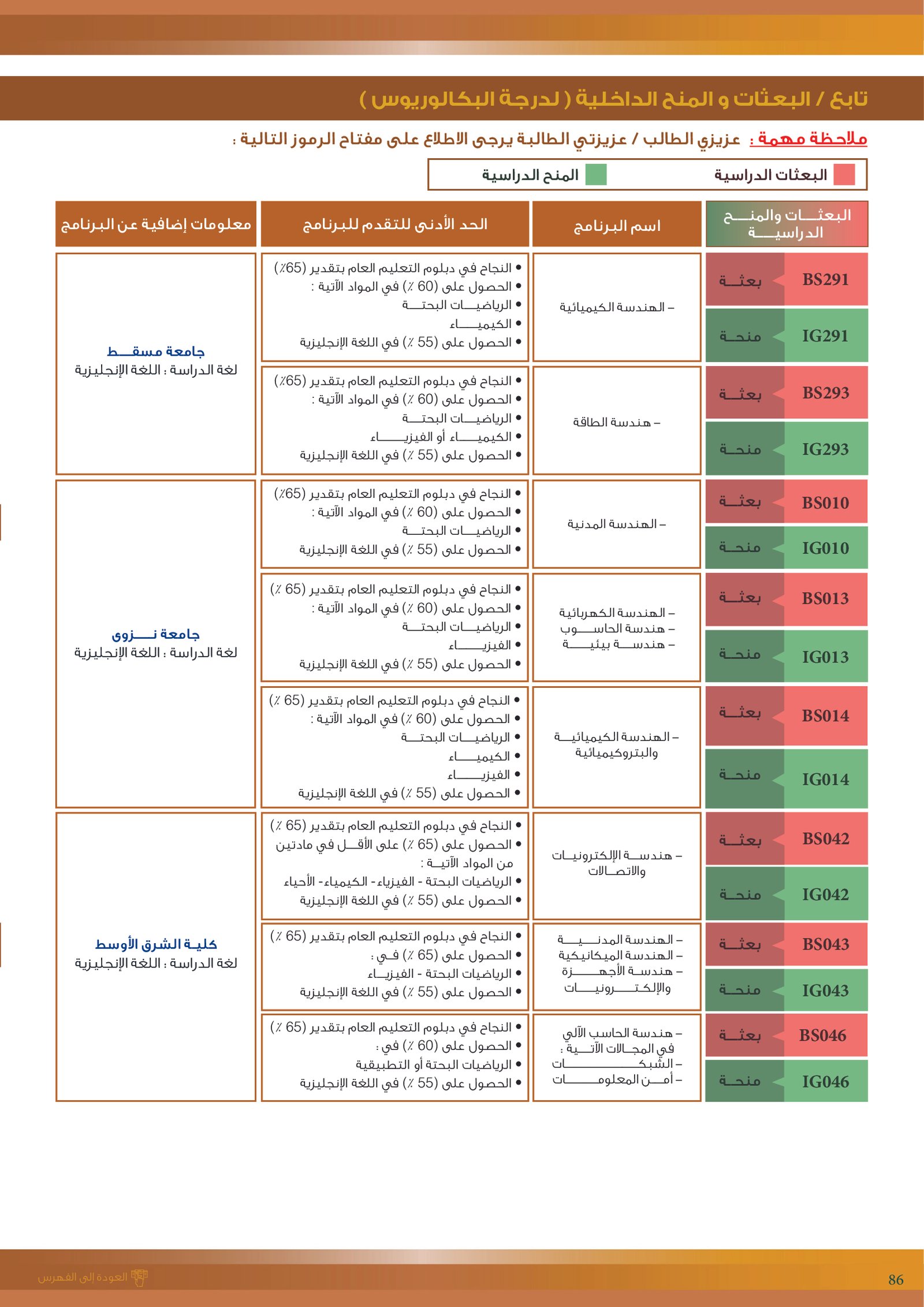 | BS289 | الصيدلة | البعثات الداخلية | أخرى | جامعة نزوى | من خلال تخصص الصَّيدلة يتم إعداد منافسين ذوي كفاءة عالية وصيادلة نشطين؛ ليوفّوا احتياجات المجتمع للعناية الصحية المتقدمة، وتفعيل أداء الخدمات الصيدلانية وصحة الإنسان من خلال العلاج بالأدوية الاقتصادية والمؤثرة والآمنة، وتحسين العناية الصحية والصناعة الدوائية، خاصة في مجال الخدمات والبحوث. كما تخدم المدرسة الطلاب بواسطة تقديم البرنامج التعليمي على أساس أفضل التدريبات الصيدلانية والتدريب المتطور والبيئة التعليمية المناسبة. |