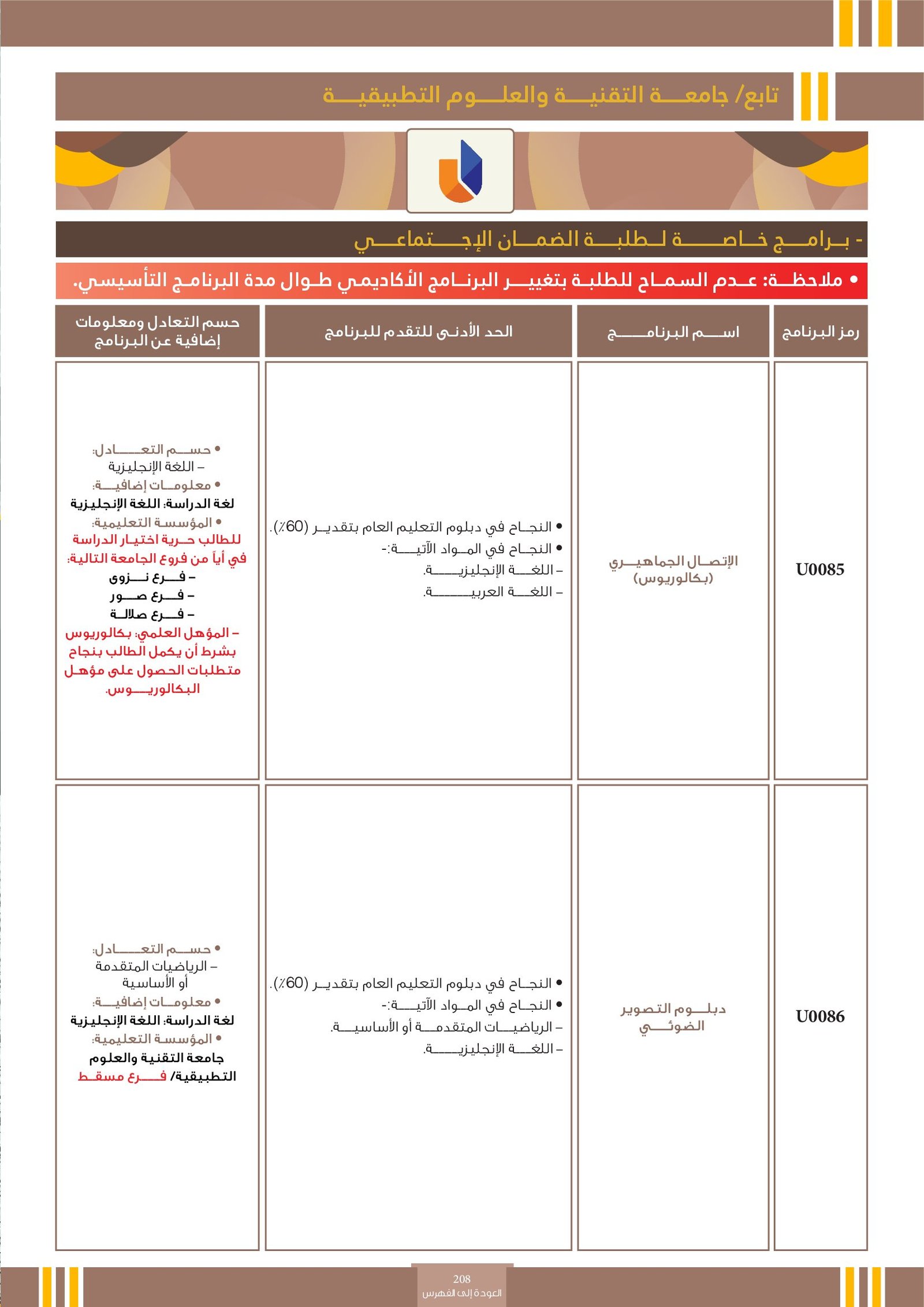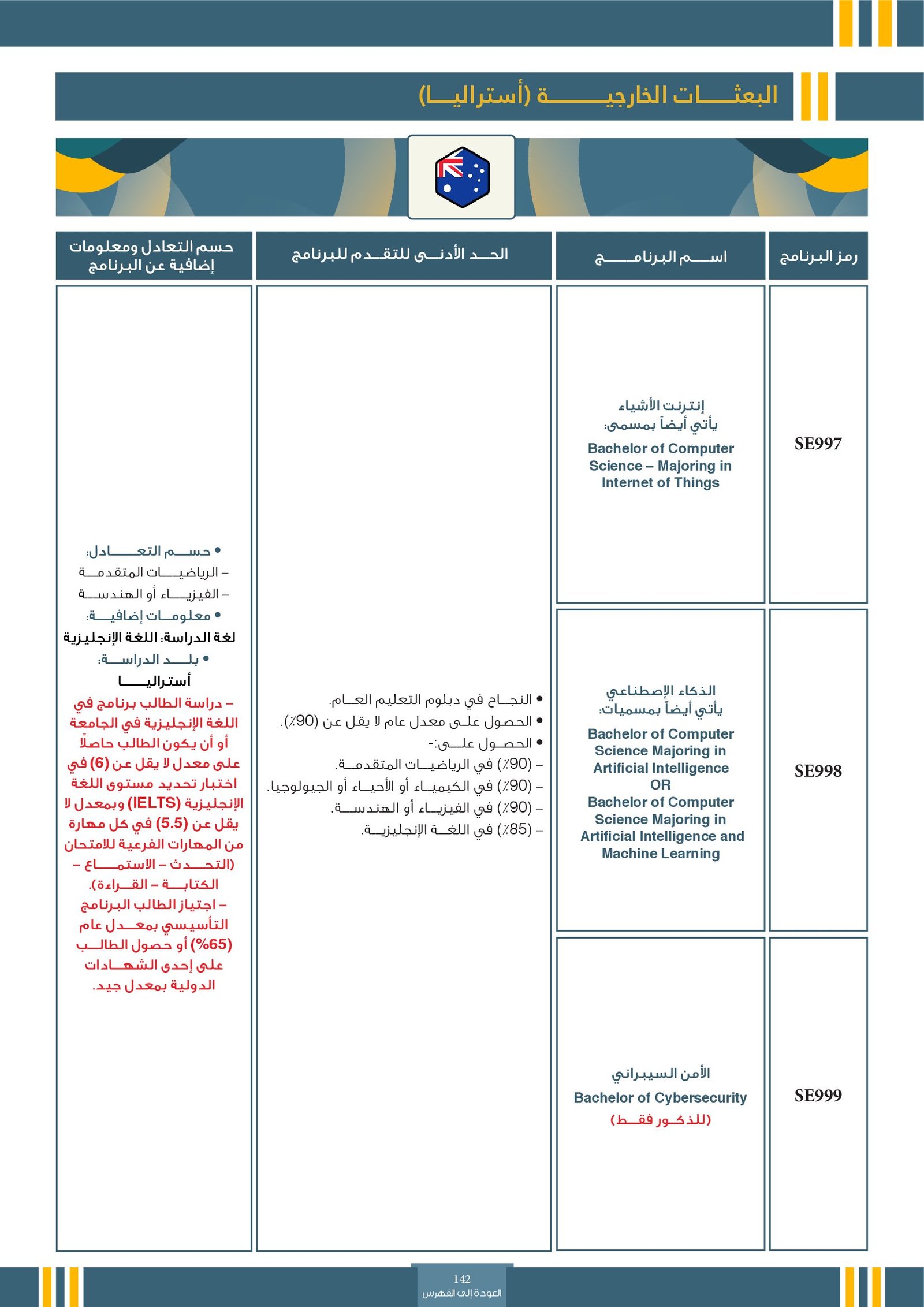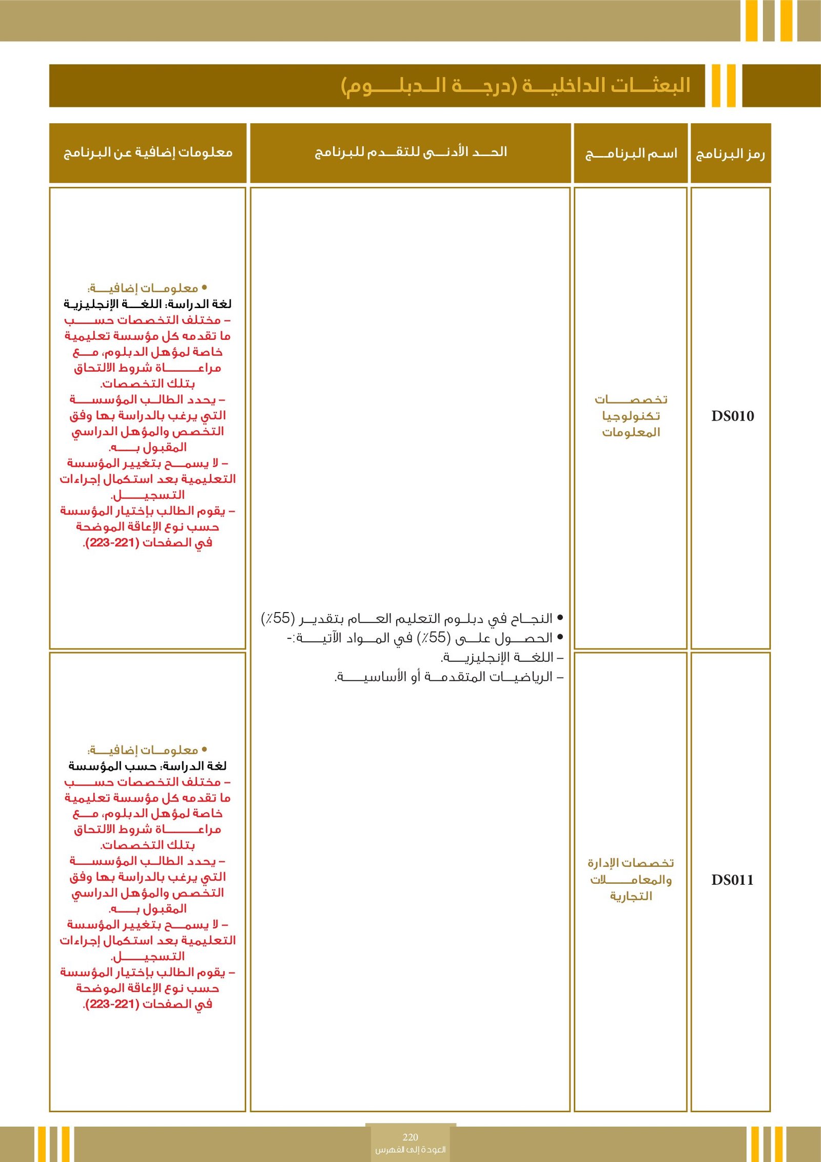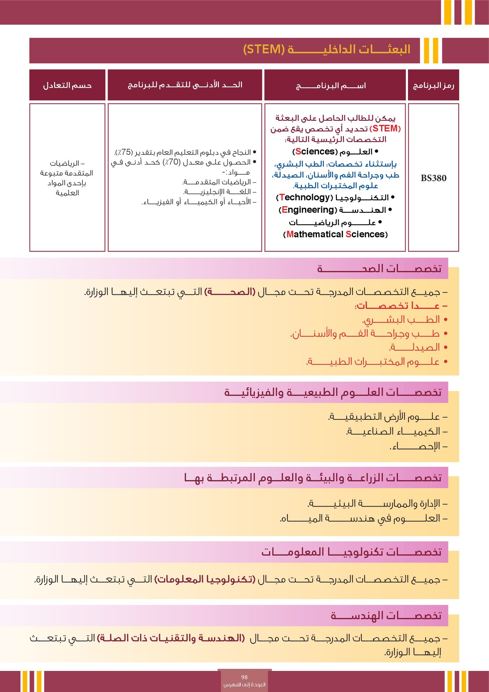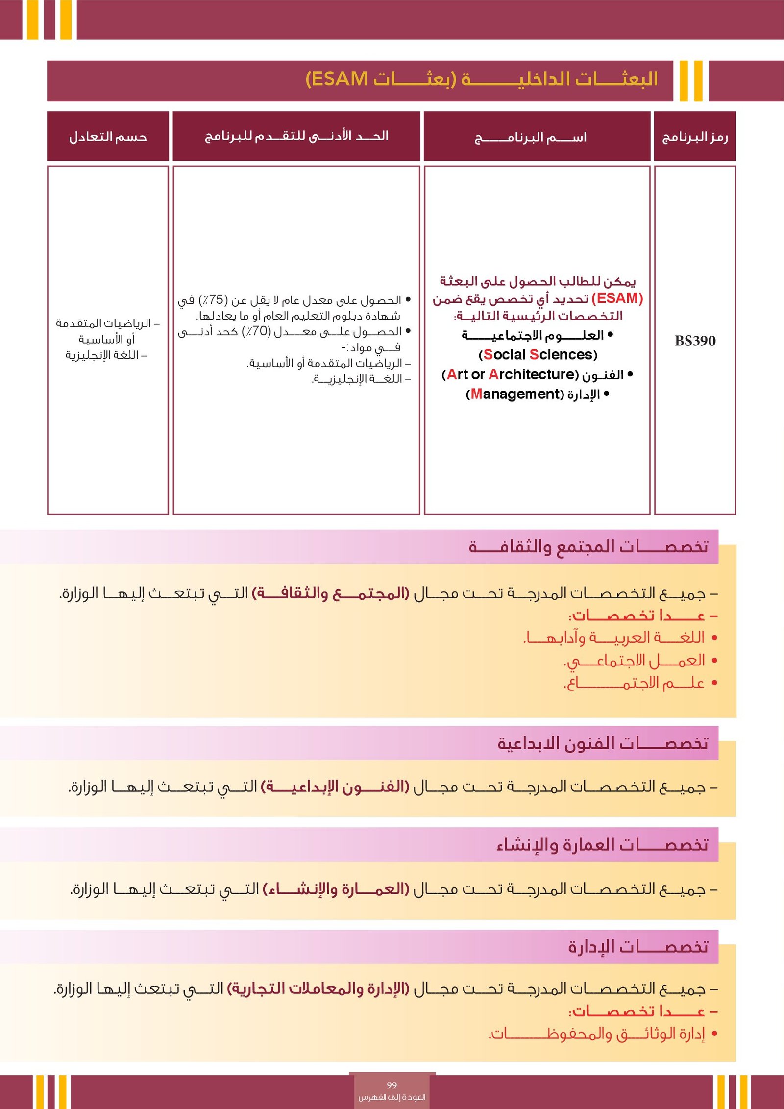 | رمز التخصص | التخصص | أنواع البرامج | فئات خاصة | المجالات الأكاديمية | التوصيف | |