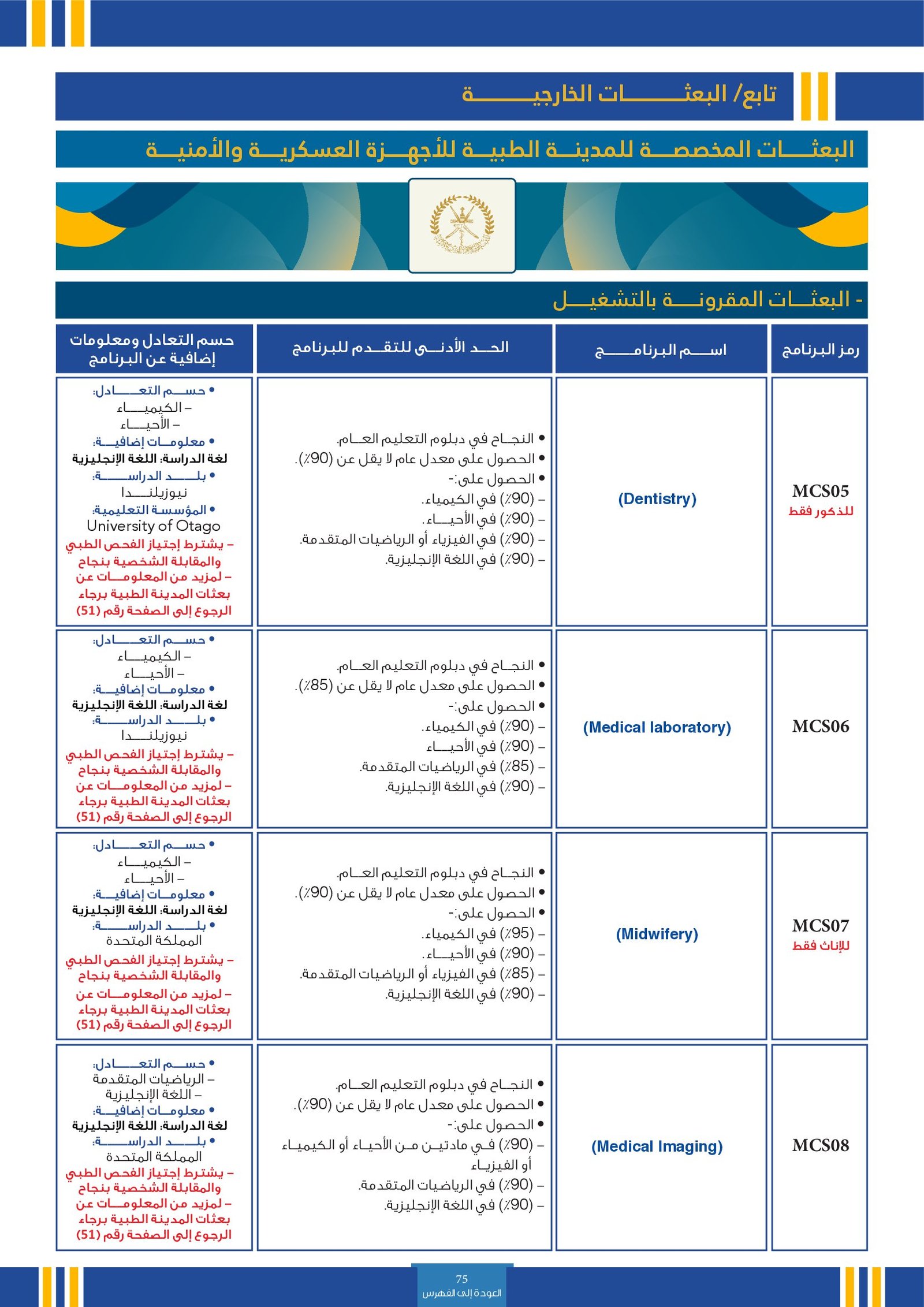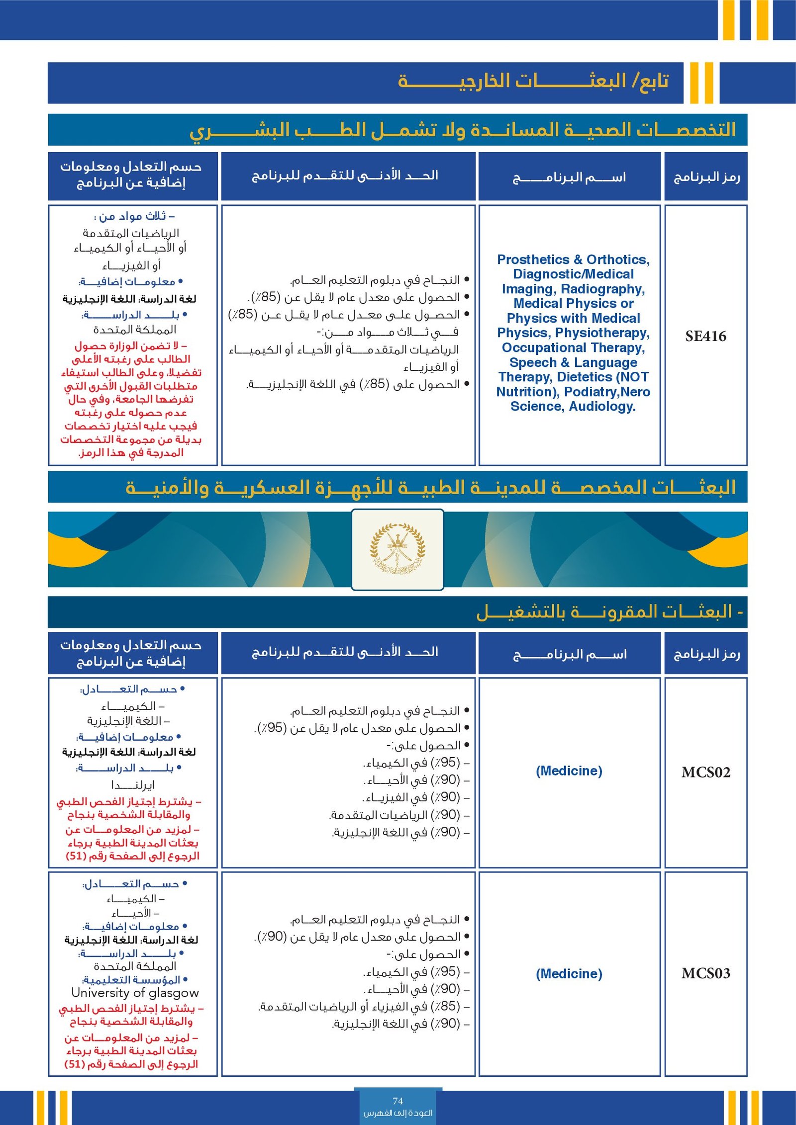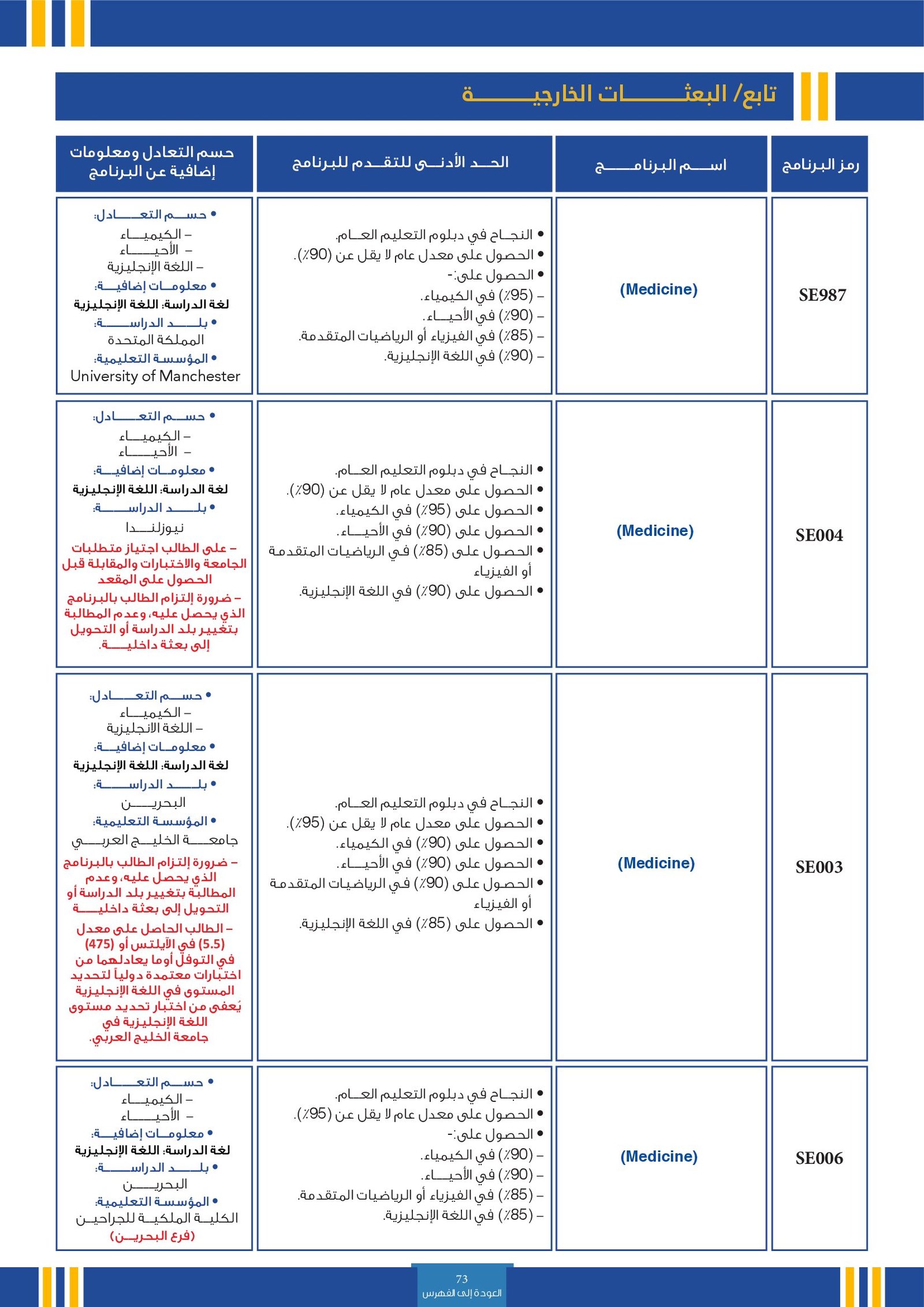 | SE003 | Medicine | البعثات الخارجية | أخرى | التفاصيل بالمرجع | حسم التعادل: