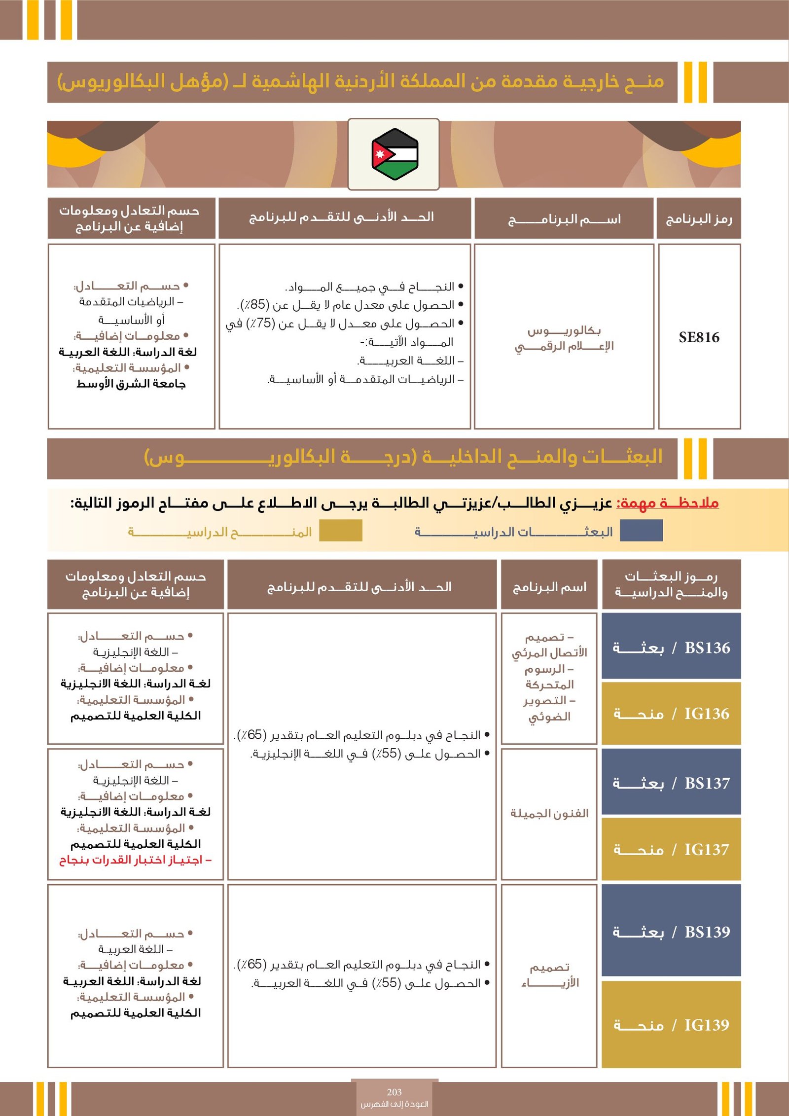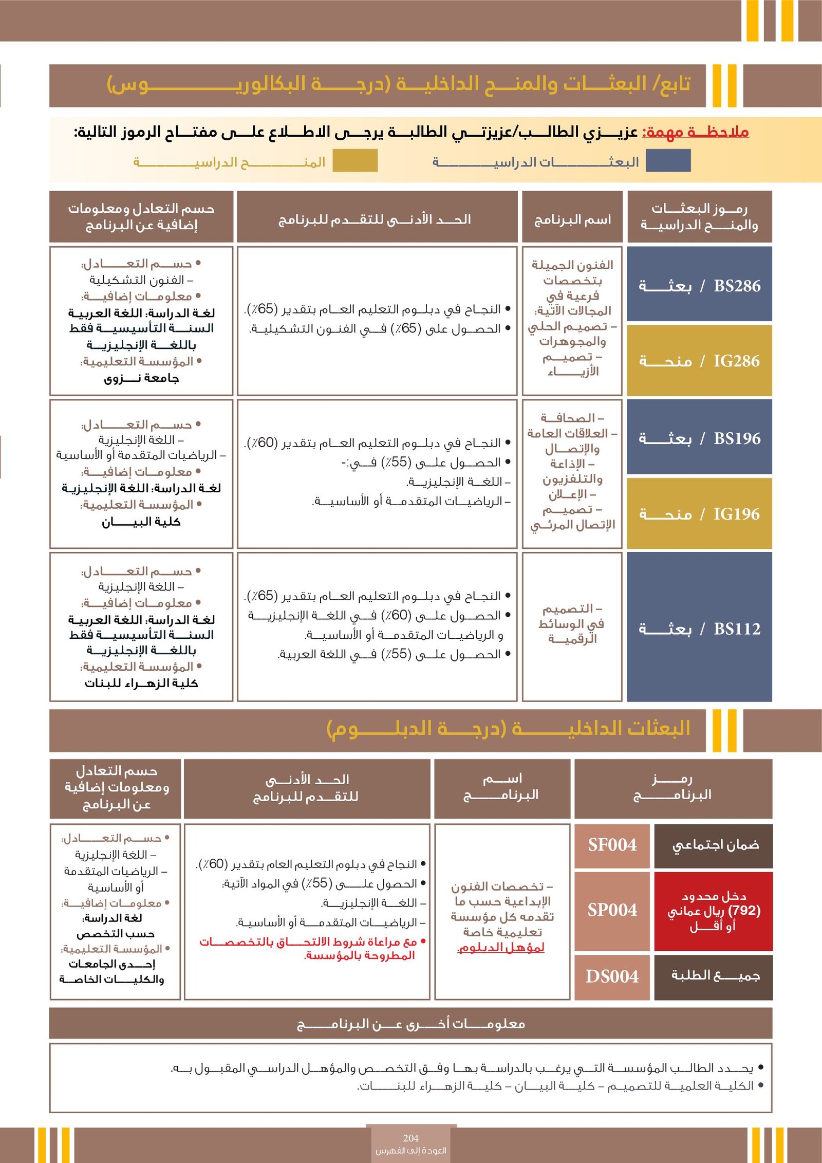| BS196 | الصحافة - العلاقات العامة و الإتصال - الإذاعة و التلفزيون - الإعلان - تصميم الإتصال المرئي | البعثات الداخلية | أخرى | كلية البيان | يُعدّ من التخصصات الحيوية التي تهدف إلى نقل المعلومات والتأثير في الرأي العام بوسائل فعّالة ومبتكرة. تركز هذه المجالات على إنتاج وتحرير المحتوى الإعلامي، بناء الصورة الذهنية للمؤسسات، التواصل مع الجمهور، والتعبير البصري عن الرسائل الإعلانية والإعلامية، باستخدام أدوات وتقنيات حديثة تجمع بين الإبداع والمهنية في عصر الإعلام الرقمي. |