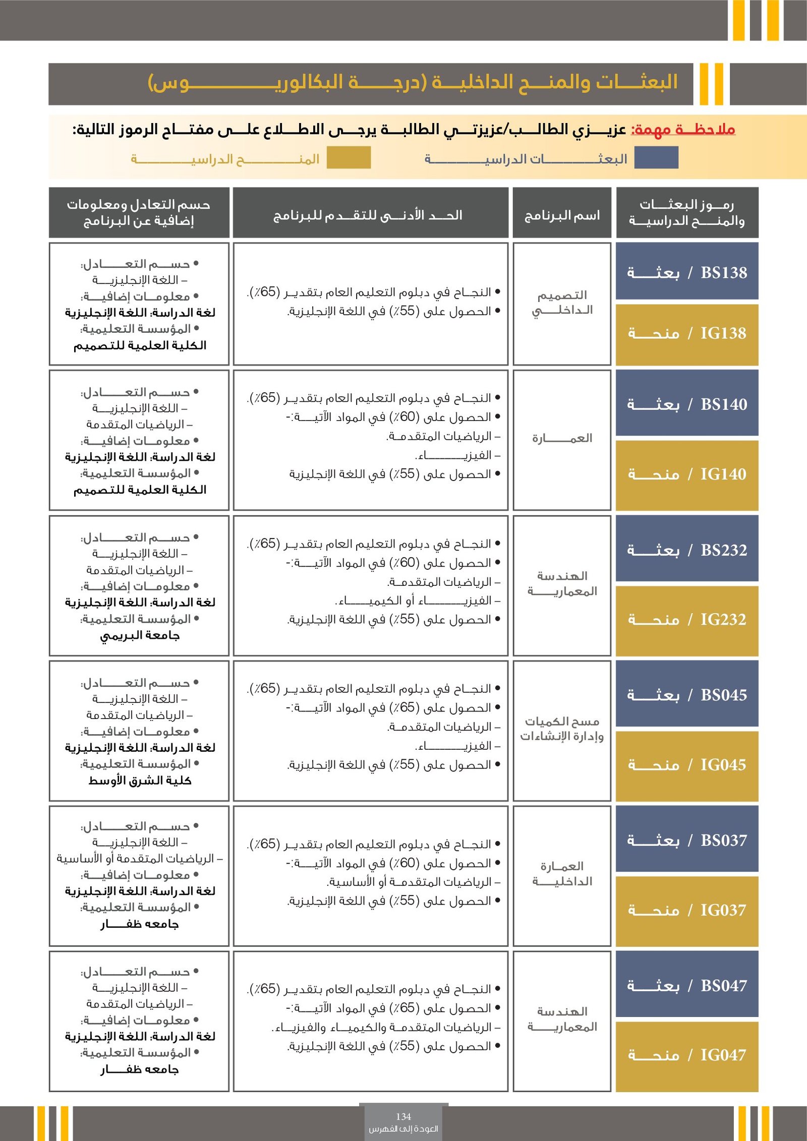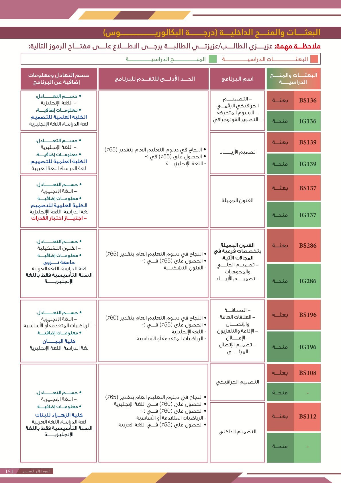 | BS276 | التصميم الجرافيكي والتصميم الداخلي | البعثات الداخلية | أخرى | التفاصيل بالمرجع | يُعنى تخصص التصميم الجرافيكي بإنشاء تصاميم بصرية تنقل الرسائل والأفكار باستخدام الألوان والصور والنصوص، ويُستخدم في الإعلانات، الهوية البصرية، والمحتوى الرقمي. أما التصميم الداخلي فيركز على تنسيق المساحات الداخلية بطريقة تجمع بين الجمال والوظيفة، ويشمل اختيار الأثاث، الإضاءة، والألوان بما يتناسب مع طبيعة المكان واحتياجات المستخدم. |
