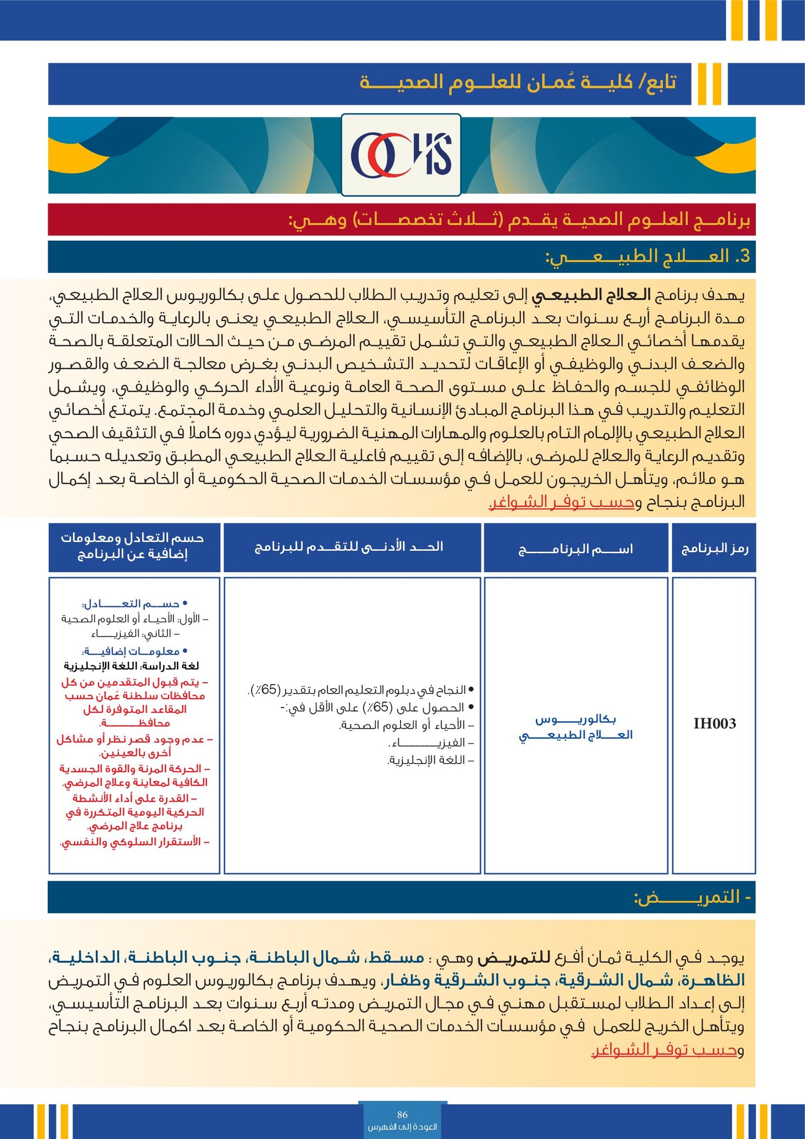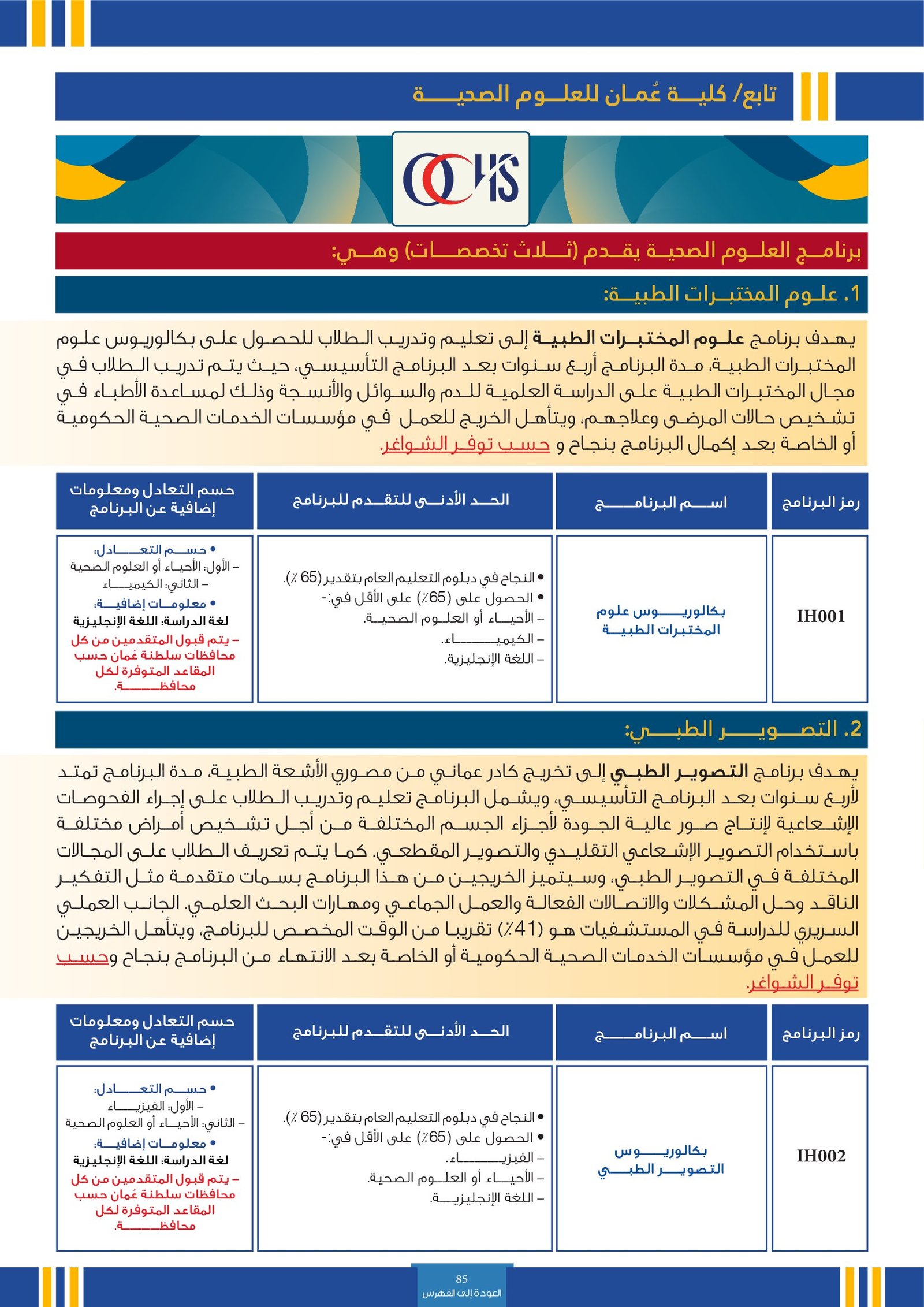 | IH002 | بكالوريوس التصوير الطبي | البعثات الداخلية | أخرى | كلية عمان للعلوم الصحية | يهدف برنامج التصوير الطبي إلى تخريج كادر عماني من مصوري الأشعة الطبية، مدة البرنامج تمتد