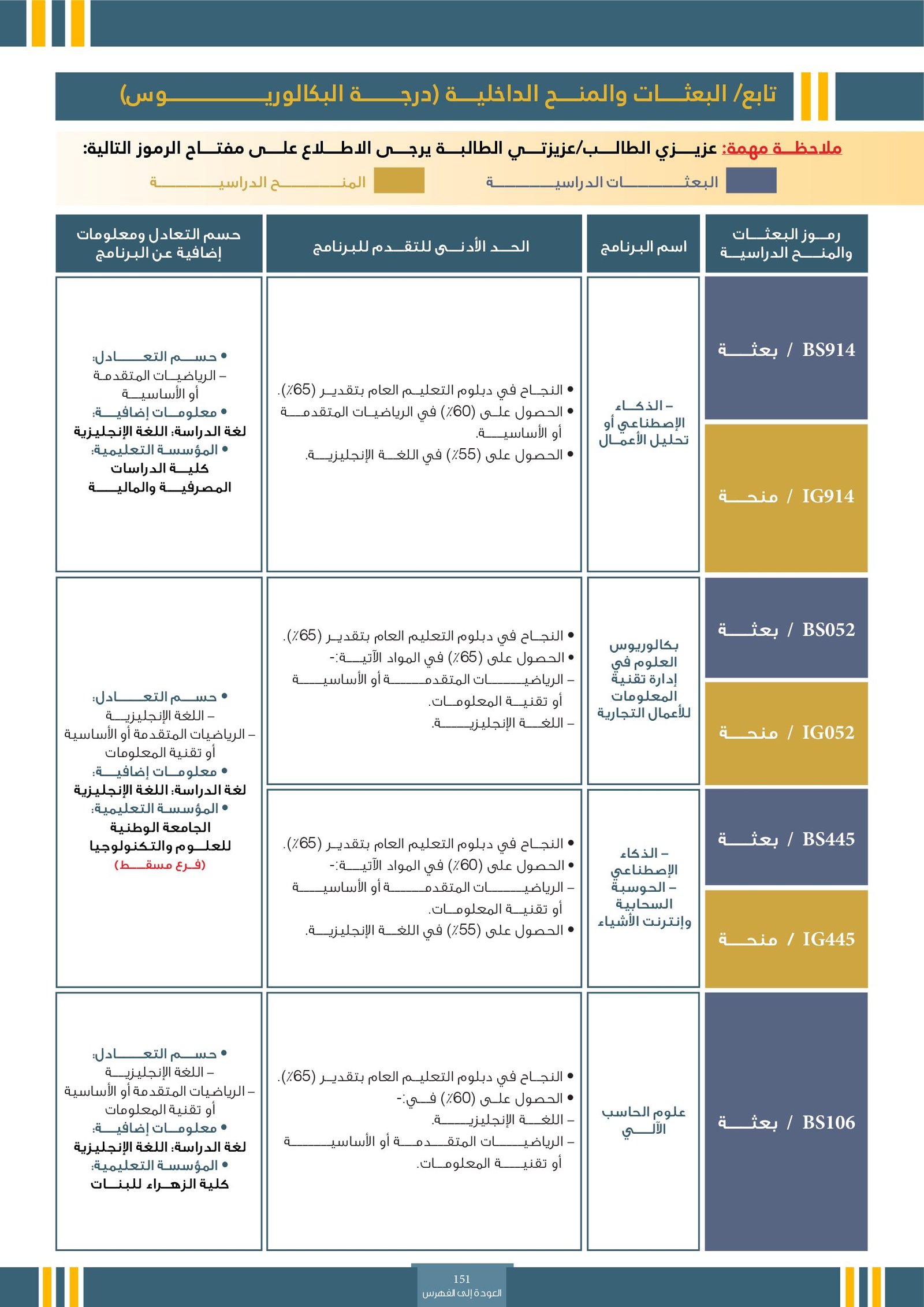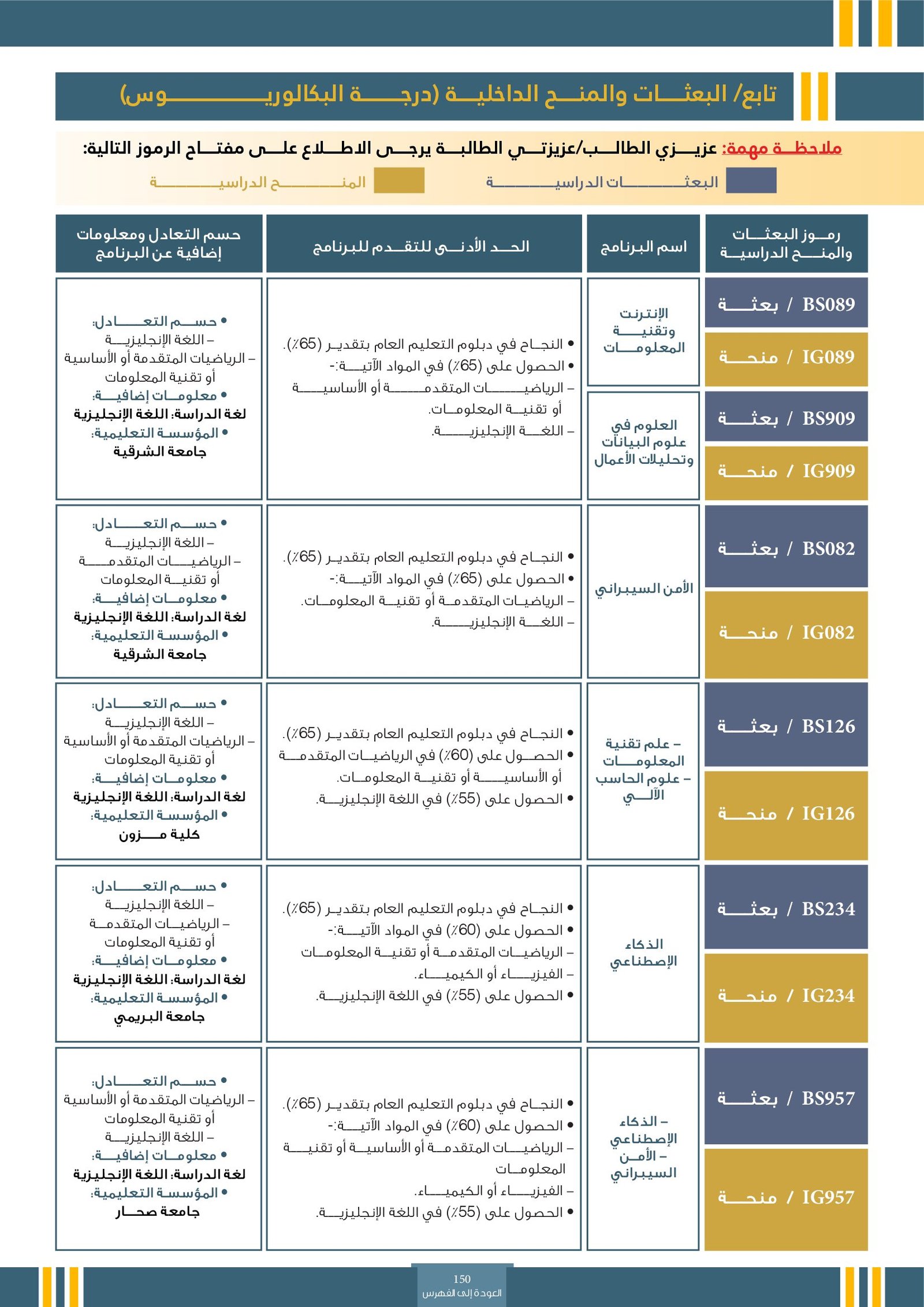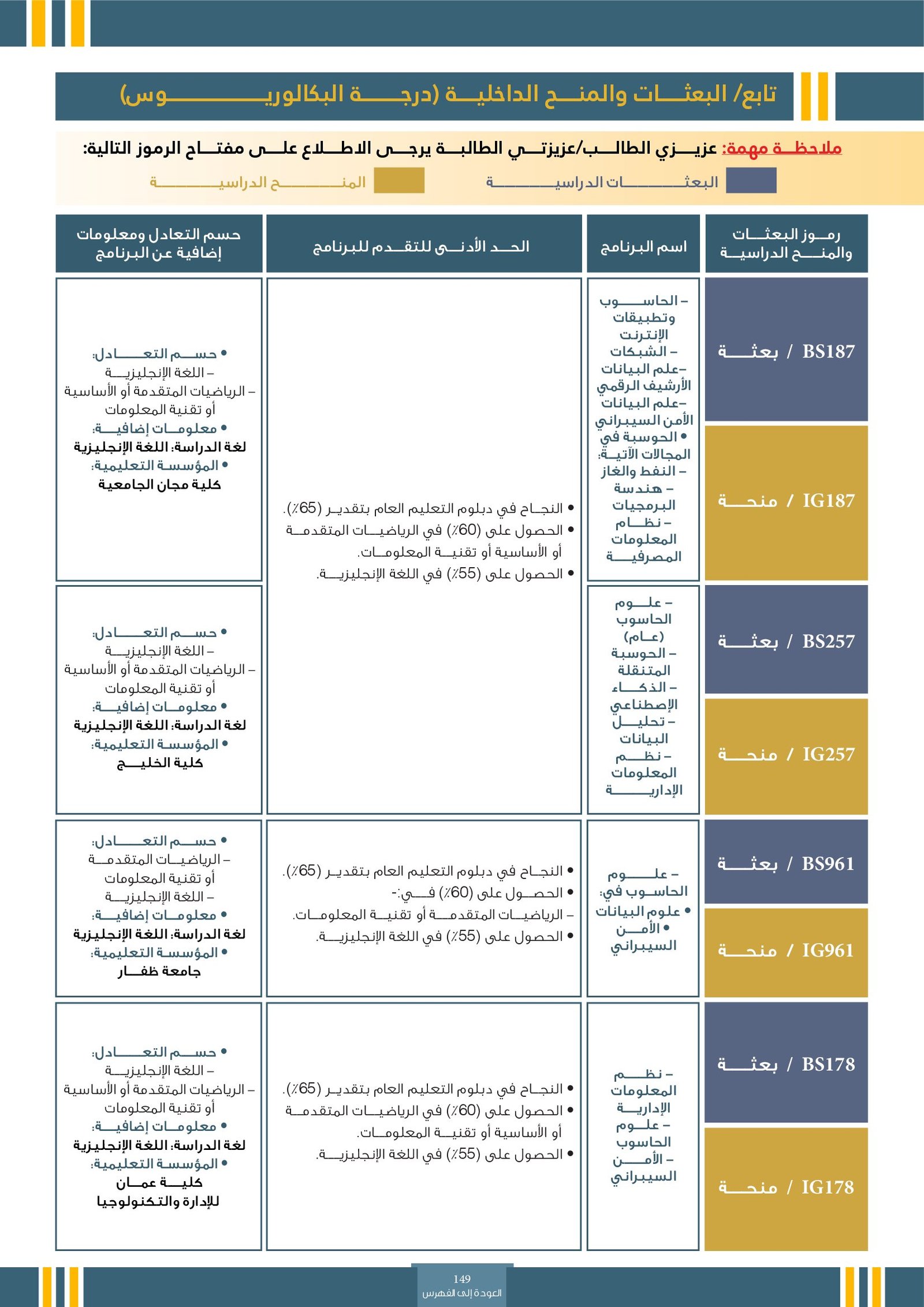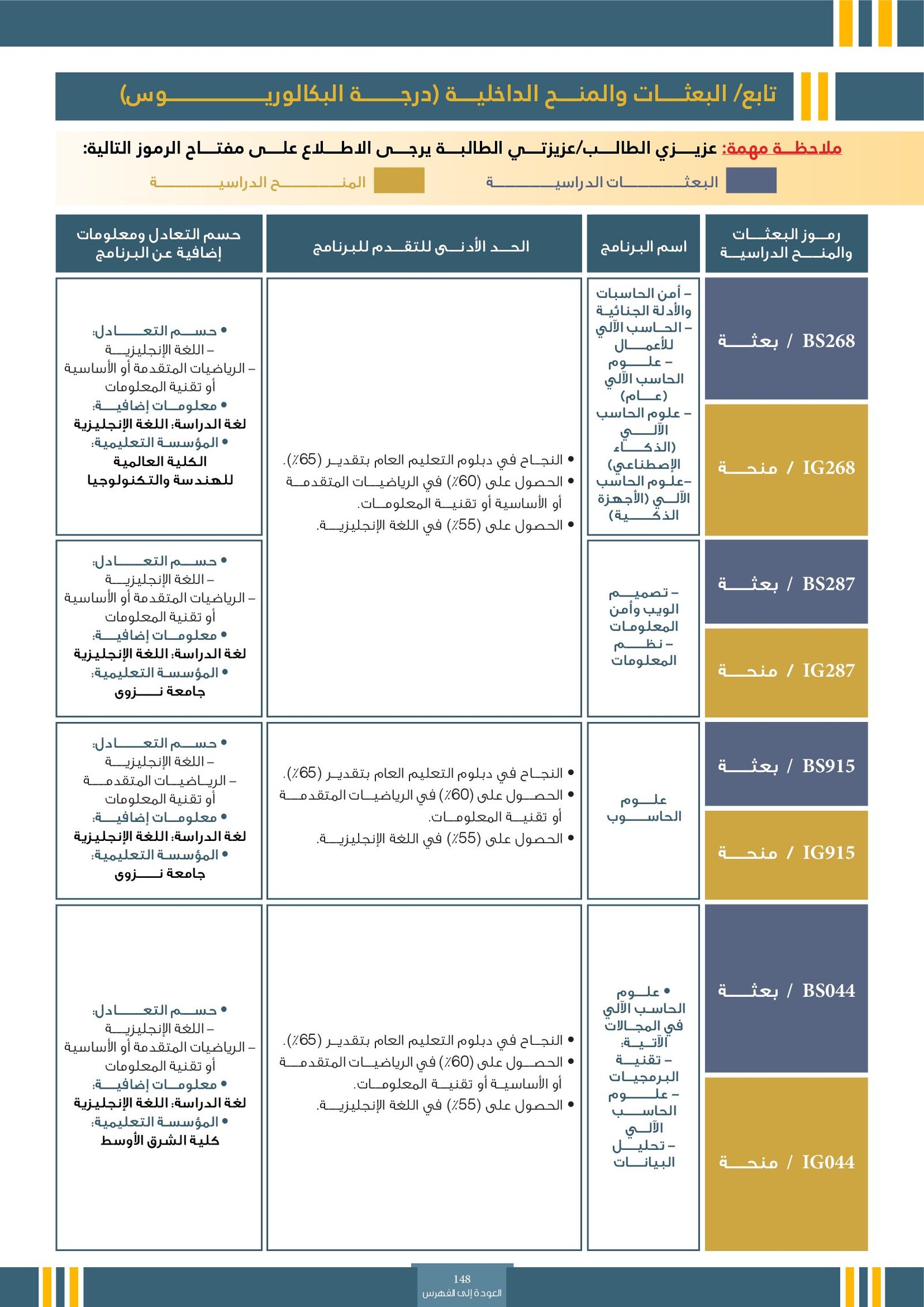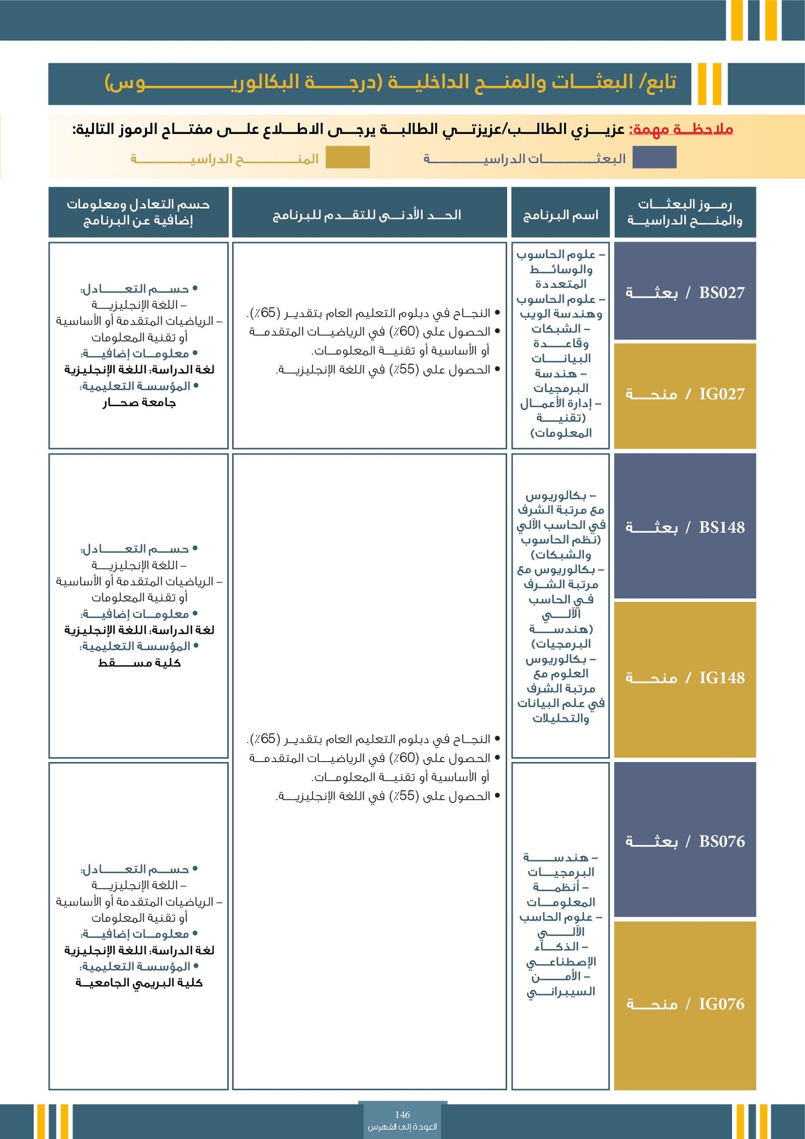 | BS261 | تخصصات تكنولوجيا المعلومات ( إعاقات جسدية ) | البعثات الداخلية | أخرى | التفاصيل بالمرجع | تُعنى باستخدام الحواسيب والبرمجيات والشبكات لإدارة ومعالجة المعلومات. من أبرز هذه التخصصات: تقنية المعلومات، علوم الحاسوب، هندسة البرمجيات، نظم المعلومات، وأمن المعلومات. تهدف هذه التخصصات إلى تأهيل الطلاب لتطوير الأنظمة الرقمية، بناء التطبيقات، حماية البيانات، وتصميم حلول تقنية تدعم مختلف القطاعات في عصر التحول الرقمي. |