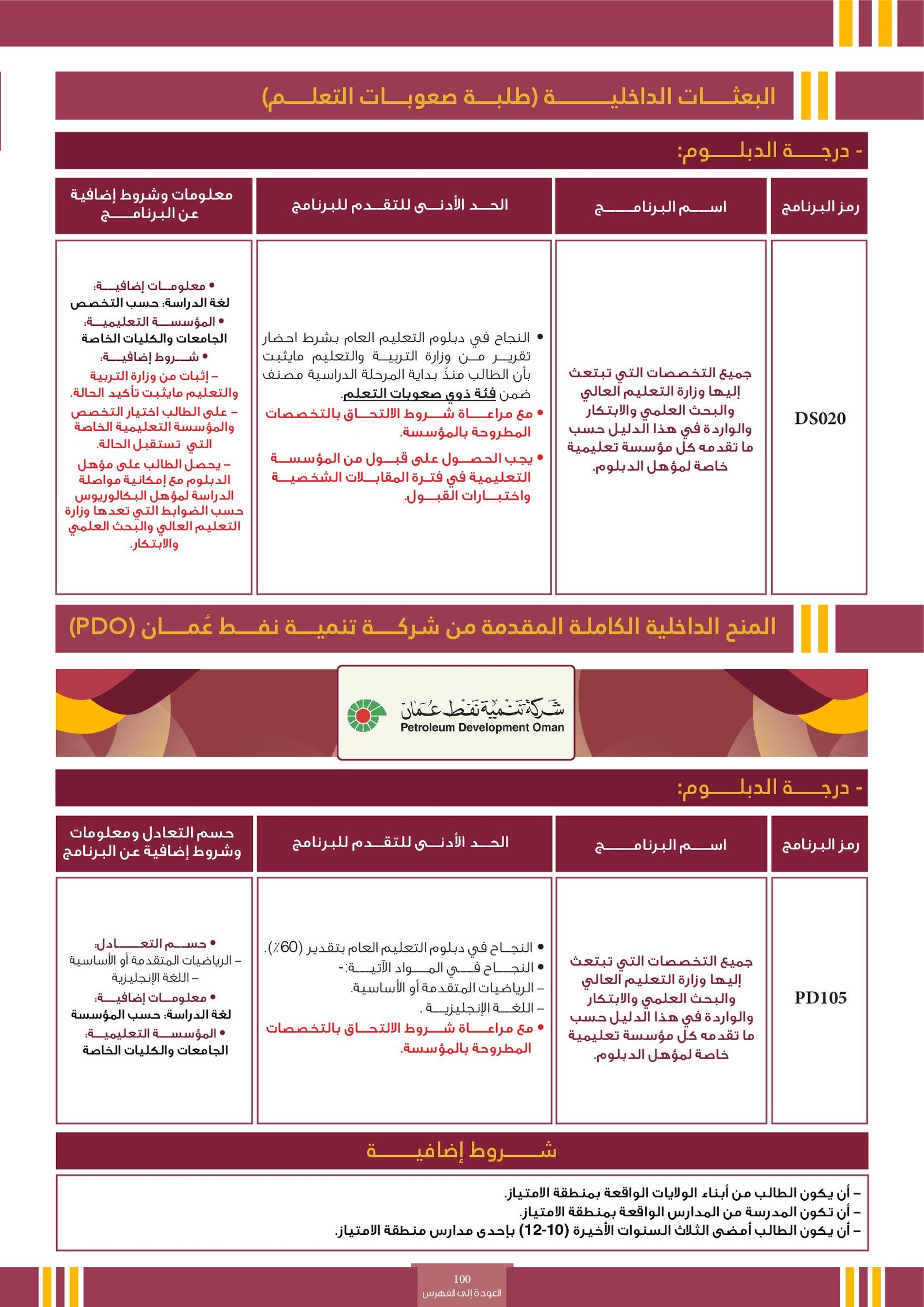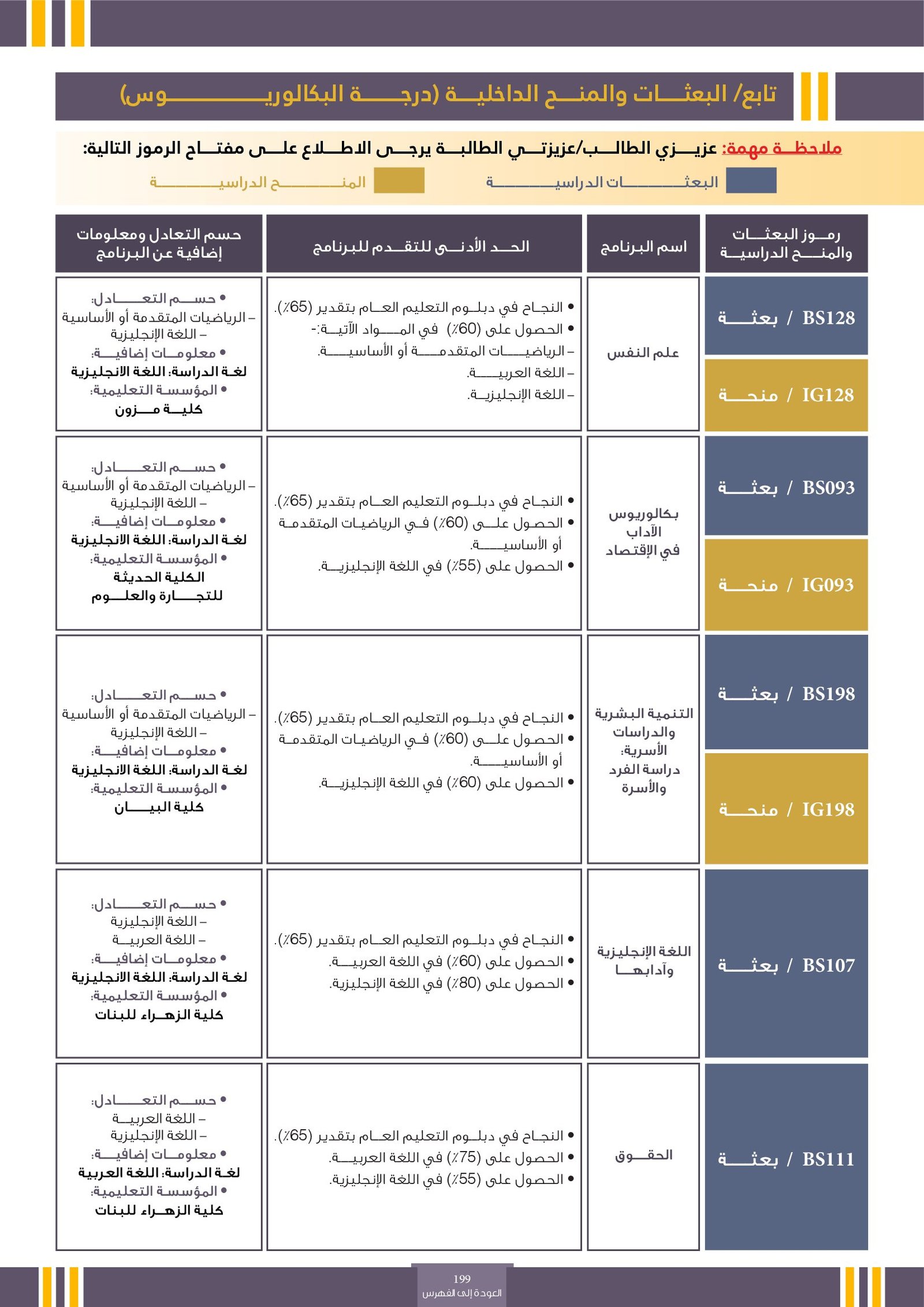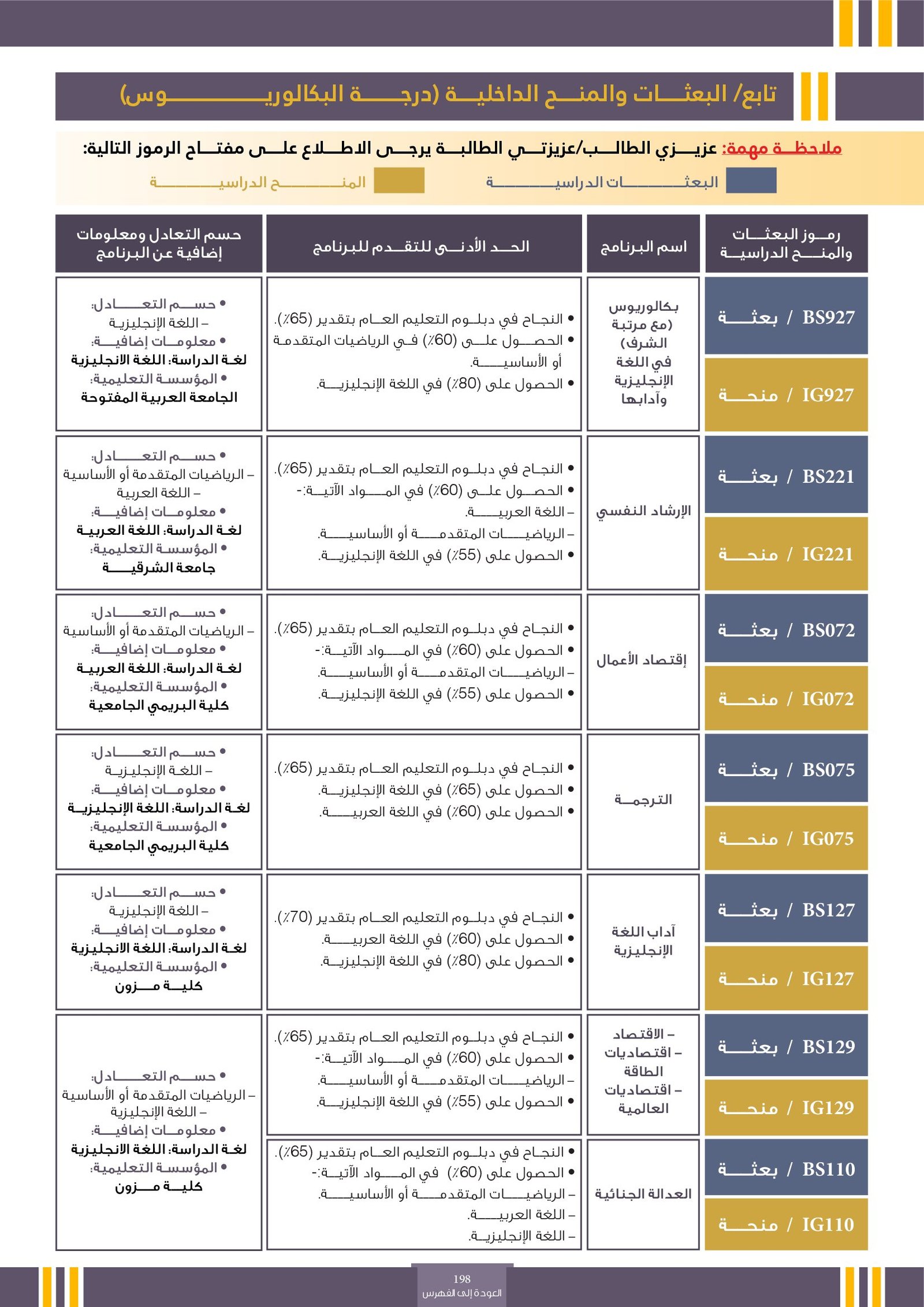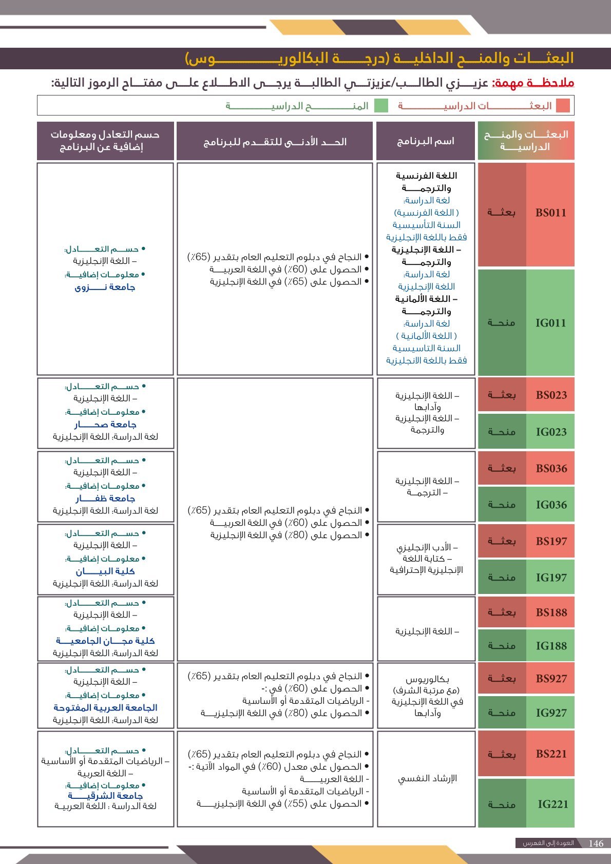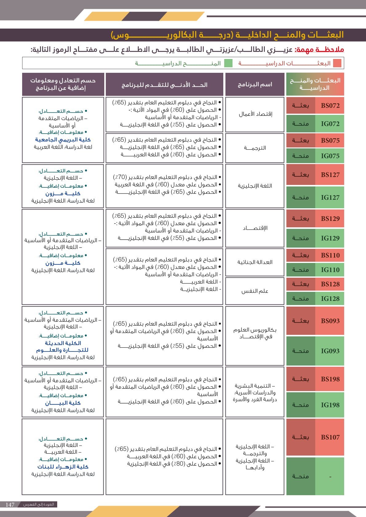 | ...... | تخصصات ذوي الاعاقة ( البعثات الداخلية ) | البعثات الداخلية | أخرى | التفاصيل بالمرجع | لمعرفة التفاصيل يرجى الاطلاع على المرجع |