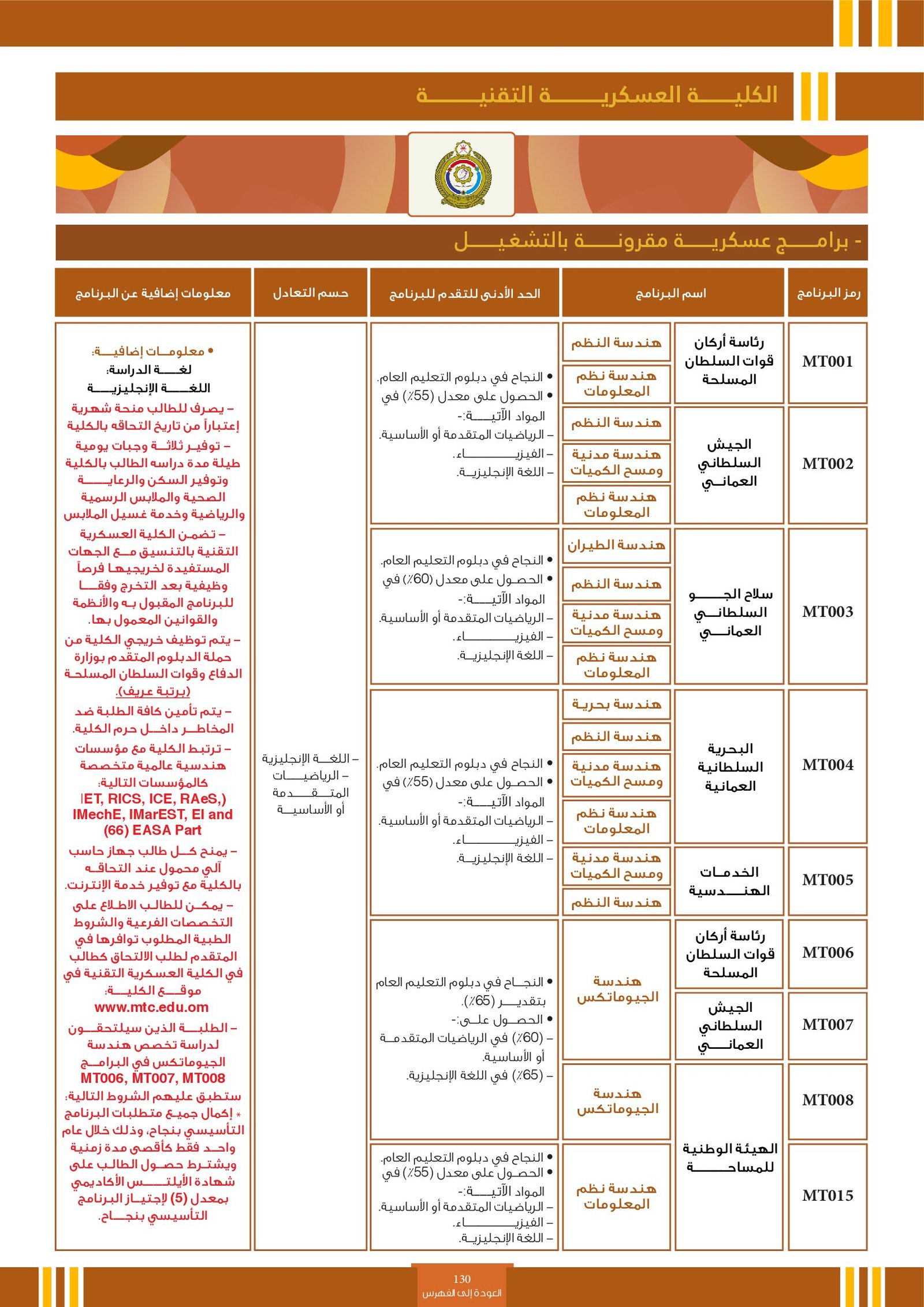 | BS940 | التخصصات الهندسية ( إعاقات الجسدية ) | البرامج الحكومية | أخرى | كلية الشرق الأوسط | تُعنى بتطبيق العلوم والرياضيات لحل المشكلات التقنية وتطوير المشاريع. من أبرزها: الهندسة المدنية التي تركز على تصميم وبناء البنية التحتية مثل الجسور والطرق، والهندسة المعمارية المعنية بتخطيط وتصميم المباني، والهندسة الكهربائية التي تهتم بالطاقة والأنظمة الكهربائية، والهندسة الميكانيكية التي تدرس الأنظمة الميكانيكية والآلات، إضافة إلى الهندسة الصناعية، وهندسة الحاسوب، والهندسة الكيميائية. تفتح هذه التخصصات مجالات واسعة للعمل في القطاعات الصناعية والإنشائية والطاقة والتقنية. |