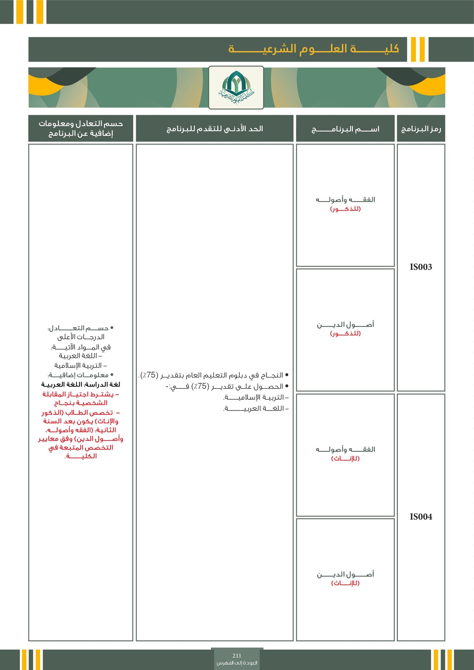 | IS004 | الفقه وأصوله - أصول الدين | البرامج الحكومية | أخرى | كلية العلوم الشرعية | يدرس الأحكام الشرعية وقواعد استنباطها، إلى جانب فهم العقائد الإسلامية الأساسية وأسسها الفكرية. يجمع التخصص بين الجوانب العملية في التشريع الإسلامي والجوانب العقائدية، بهدف تأصيل الفهم الديني وتعزيز التطبيق الصحيح للشريعة. |