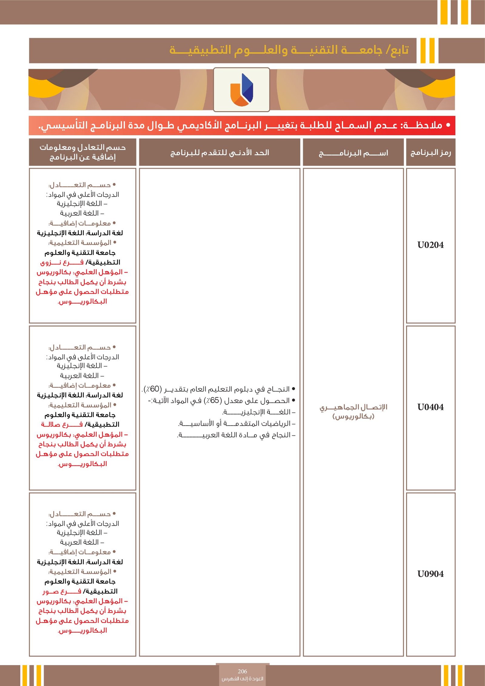 | U0204 | الإتصال الجماهيري | البرامج الحكومية | أخرى | جامعة التقنية و العلوم التطبيقية | تخصص يدرس طرق وأدوات نقل المعلومات والأفكار إلى جمهور واسع عبر وسائل الإعلام المختلفة مثل الصحافة، التلفزيون، الإذاعة، الإنترنت، والإعلانات. يركز التخصص على فهم تأثير الرسائل الإعلامية في تشكيل الرأي العام والسلوكيات الاجتماعية، ويُعزز مهارات تحليل وتوجيه المحتوى الإعلامي بفعالية لتحقيق أهداف إعلامية وثقافية واجتماعية. |