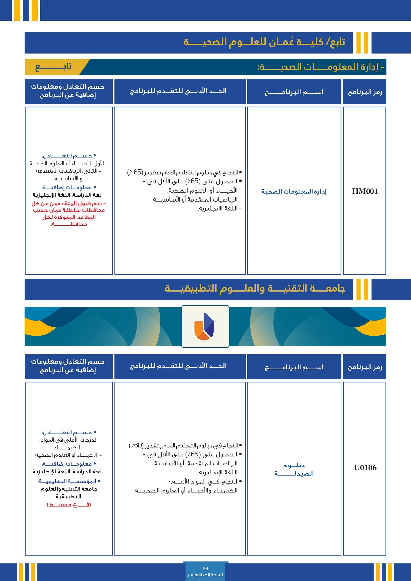 | IH001 | بكالوريوس علوم المختبرات الطبية | البعثات الداخلية | أخرى | كلية عمان للعلوم الصحية | يهدف برنامج الصيدلة إلى تعليم وتدريب الطلاب للحصول على بكالوريوس الصيدلة. مدة البرنامج أربع سنوات بعد البرنامج التأسيسي. يتوجب على الطالب إكمال المقررات المهنية بنجاح وهي الممارسة الصيدلانية وأشكال الجرعات والعلاجيات التطبيقية والكيمياء الصيدلانية والطبية وغيرها بالإضافة إلى المقررات غير المهنية الأخرى. يتأهل الخريج للعمل في مؤسسات الخدمات الصحية الحكومية أو الخاصة بعد اكمال البرنامج بنجاح وحسب توفـر الشواغر. |