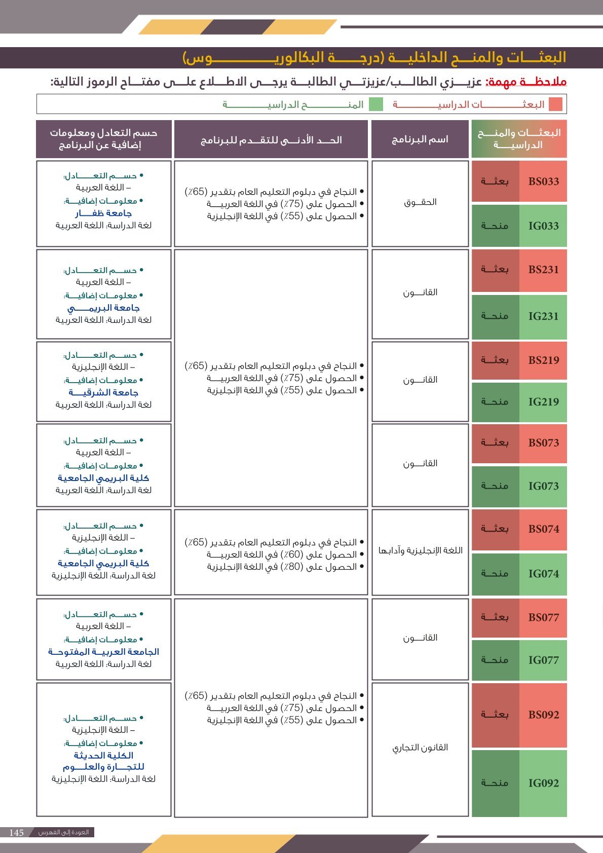 | BS263 | تخصصات القانون ( إعاقات جسدية / بصرية ) | البعثات الداخلية | أخرى | التفاصيل بالمرجع | مجالات دراسية تُعنى بفهم الأنظمة القانونية وتطبيقها لتنظيم العلاقات في المجتمع وحماية الحقوق. تشمل هذه التخصصات: القانون العام (مثل القانون الدستوري والإداري)، القانون الخاص (مثل المدني والتجاري)، القانون الجنائي، القانون الدولي، وقانون الأحوال الشخصية. يهدف هذا المجال إلى تأهيل كوادر قادرة على العمل في المحاماة، القضاء، الاستشارات القانونية، والوظائف الحكومية، مع تعزيز مبادئ العدالة وسيادة القانون. |