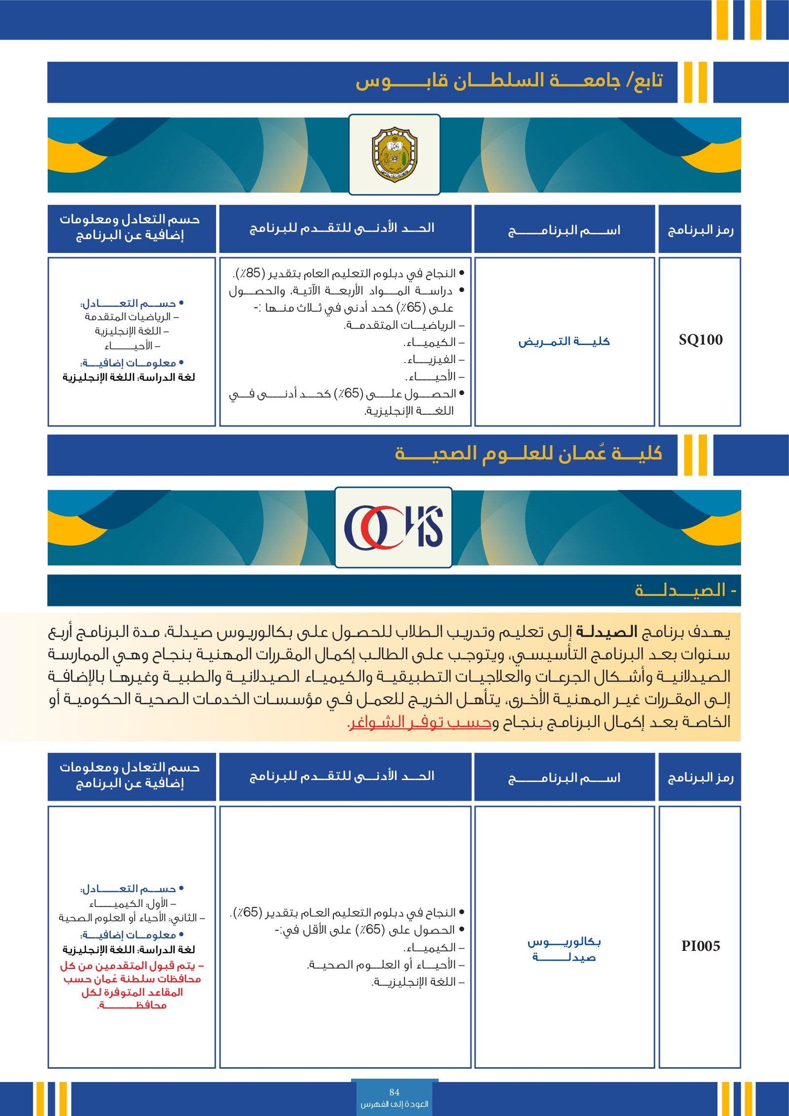 | PI005 | بكالوريوس صيدلة | البعثات الداخلية | أخرى | كلية عمان للعلوم الصحية | يهدف برنامج الصيدلة إلى تعليم وتدريب الطلاب للحصول على بكالوريوس الصيدلة. مدة البرنامج أربع سنوات بعد البرنامج التأسيسي. يتوجب على الطالب إكمال المقررات المهنية بنجاح وهي الممارسة الصيدلانية وأشكال الجرعات والعلاجيات التطبيقية والكيمياء الصيدلانية والطبية وغيرها بالإضافة إلى المقررات غير المهنية الأخرى. يتأهل الخريج للعمل في مؤسسات الخدمات الصحية الحكومية أو الخاصة بعد اكمال البرنامج بنجاح وحسب توفـر الشواغر. |
