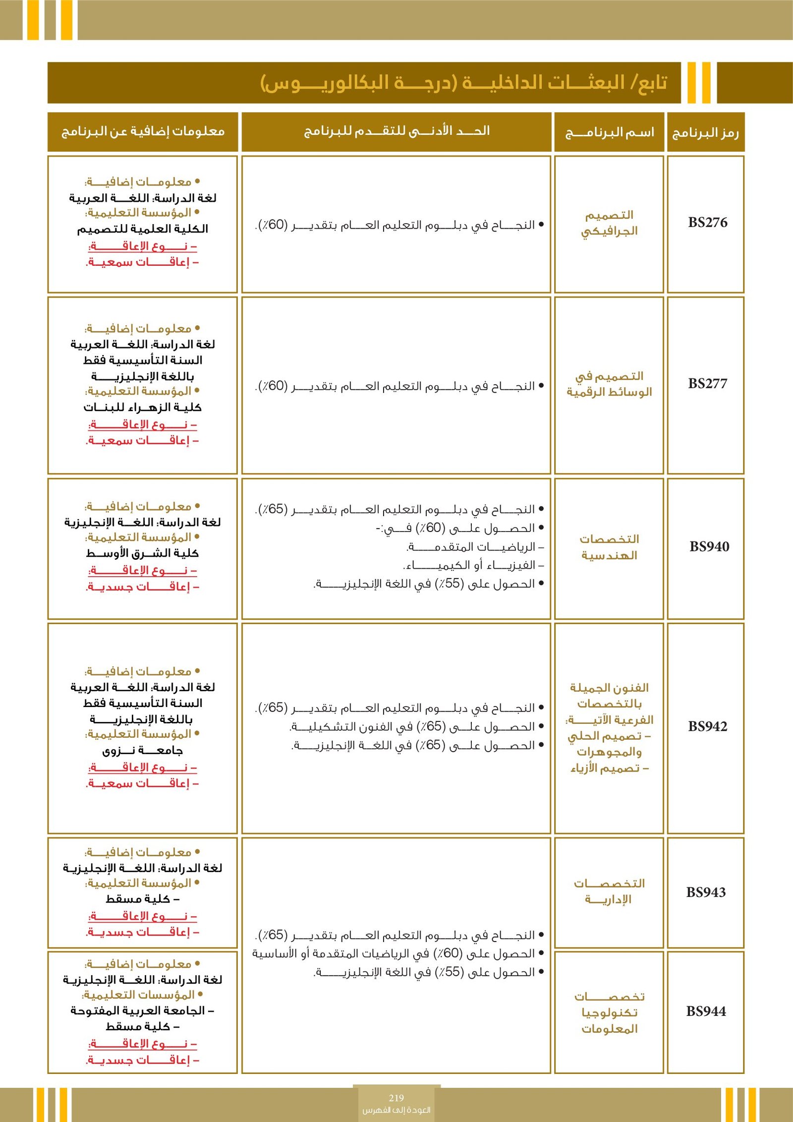 | BS267 | التصميم الجرافيكي ( إعاقات سمعية ) | البرامج الحكومية | أخرى | الكلية العلمية للتصميم | المرجع | |